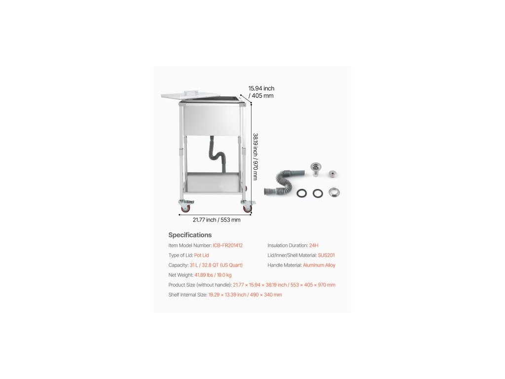 Vnitřní rozměry police: 19,29 x 13,39 palce / 490 x 340 mm,Materiál víka/vnitřku/skořepiny: SUS201,Typ víka: Víko na hrnec,Objem: 31 l / 32,8 QT (americký kvart),Číslo modelu položky: ICB-FR201412,Doba izolace: 24 hodin,Rozměry produktu (bez rukojeti): 21,77 x 15,94 x 38,19 palce / 553 x 405 x 970 mm, Čistá hmotnost: 41,89 lbs / 19,0 kg, Materiál rukojeti: Hliníková slitina