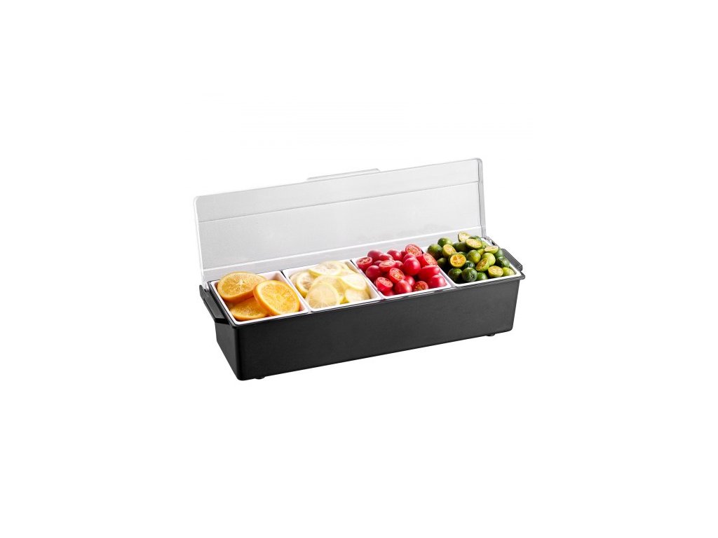 Chlazený servírovací tác na koření, 4přihrádková ledově chlazená servírovací nádoba na koření, chlazený ozdobný tác, barový tác s víkem, pro barmanskou práci a servírování tacos, salátů, ovoce, domácích a restauračních potřeb