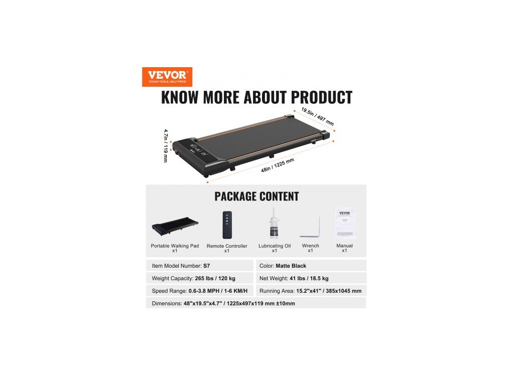 Nosnost: 120 kg, Barva: Matná černá, Číslo modelu: S7, Rozměry: 1225x497x119 mm ±10 mm, Čistá hmotnost: 18,5 kg, Rozsah rychlosti: 1-6 km/h, Běžecká plocha: 385x1045 mm