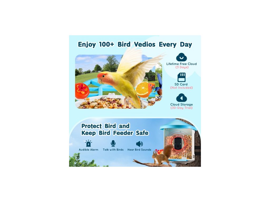 Chytré krmítko pro ptáky s kamerou, 2K HD AI identifikuje více než 10 000 druhů ptáků, solární kamera pro pozorování ptáků s automatickým snímáním a okamžitým upozorněním, bezdrátový venkovní dárek pro milovníky ptáků (2 solární panely)Odplaší veverky