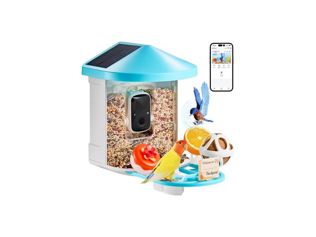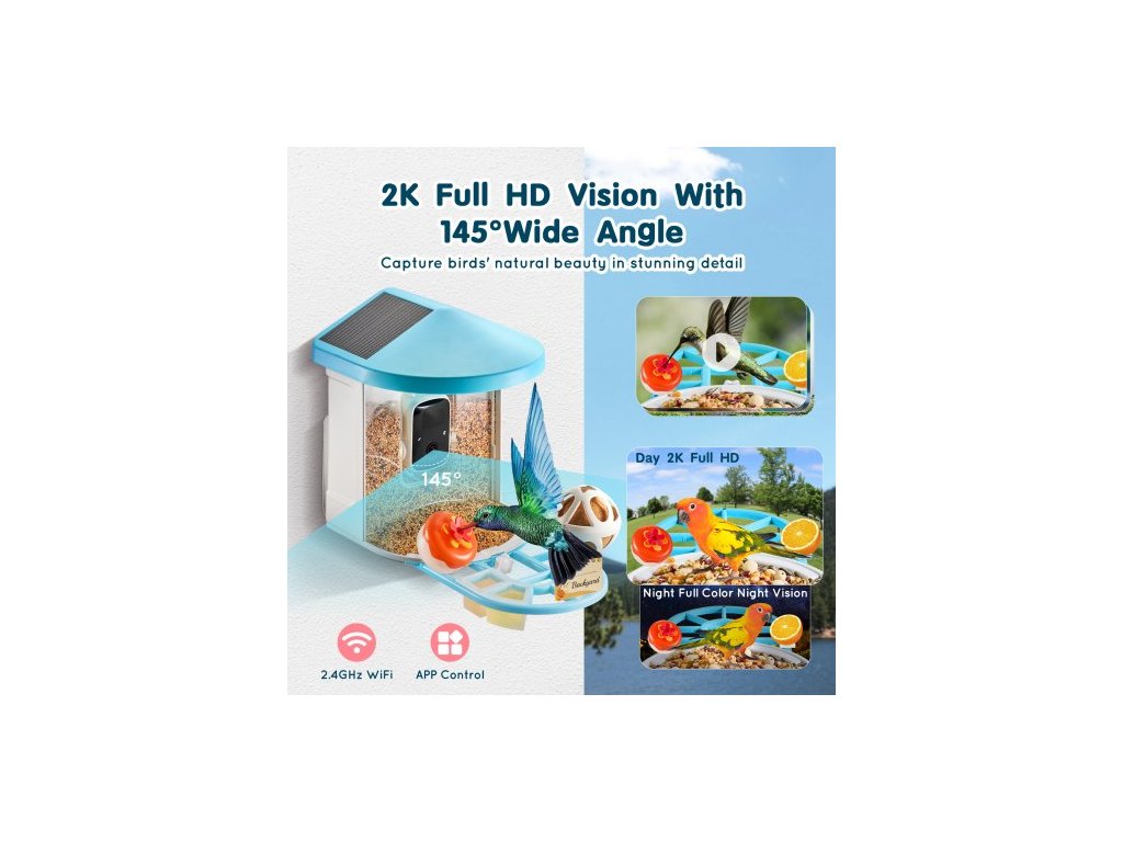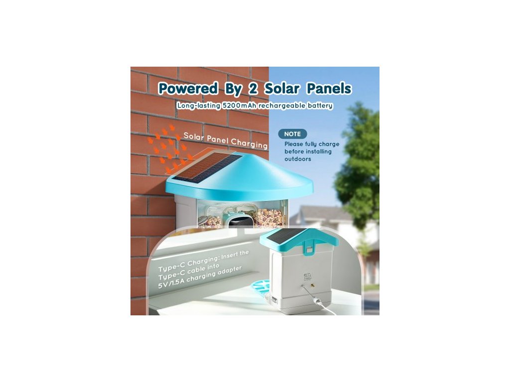 Počet solárních panelů: 2 (na střeše),Kapacita nádoby na krmivo: 2L,Kapacita baterie: 5200 mAh,Číslo modelu položky: FB-A04,Hmotnost výrobku: 2,8 lbs / 1,3 kg,Rozměry výrobku: 13,1 x 8,6 x 10,8 palce / 335 x 220 x 275 mm (včetně stojanu),Rozlišení kamery: 2K (2304 * 1296)