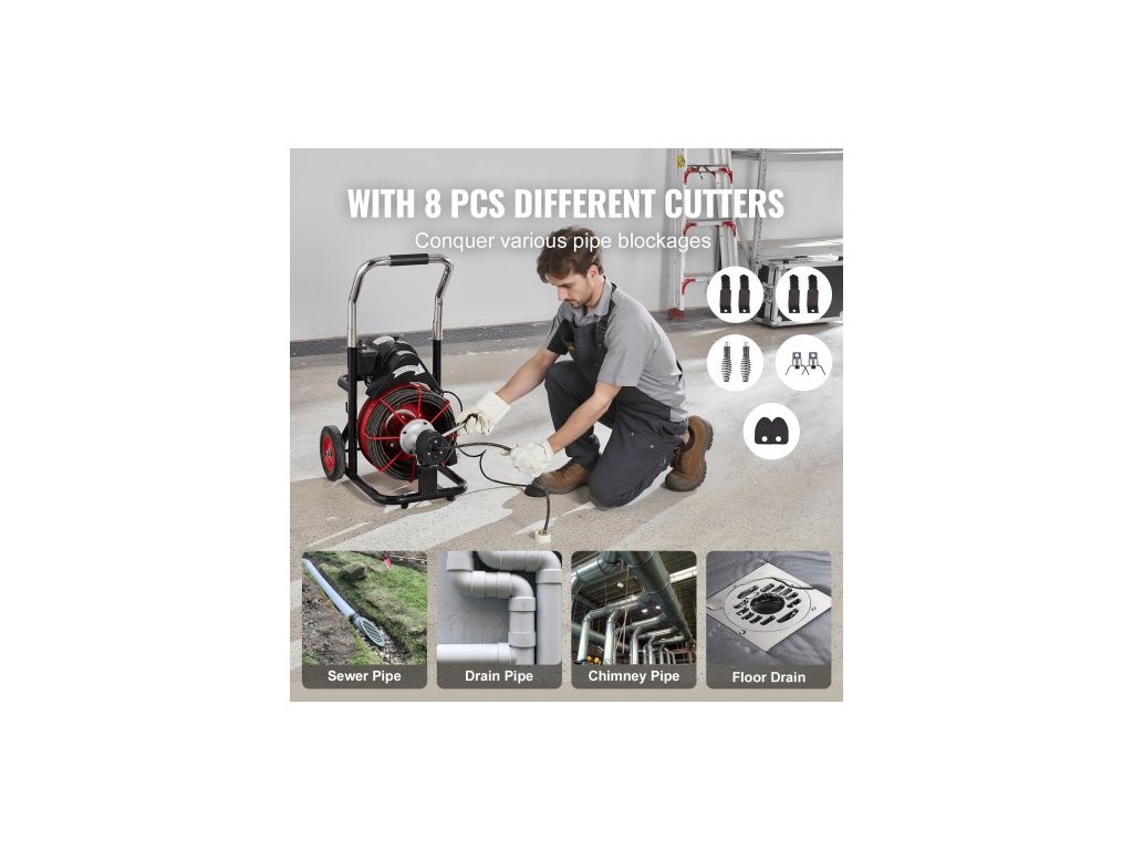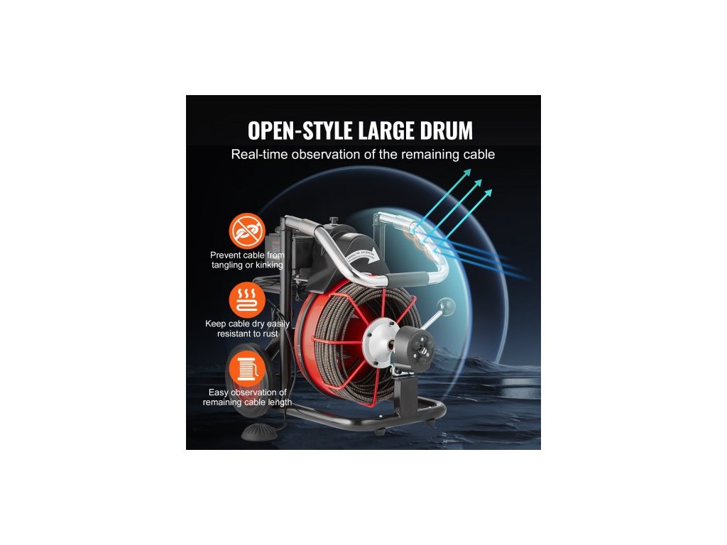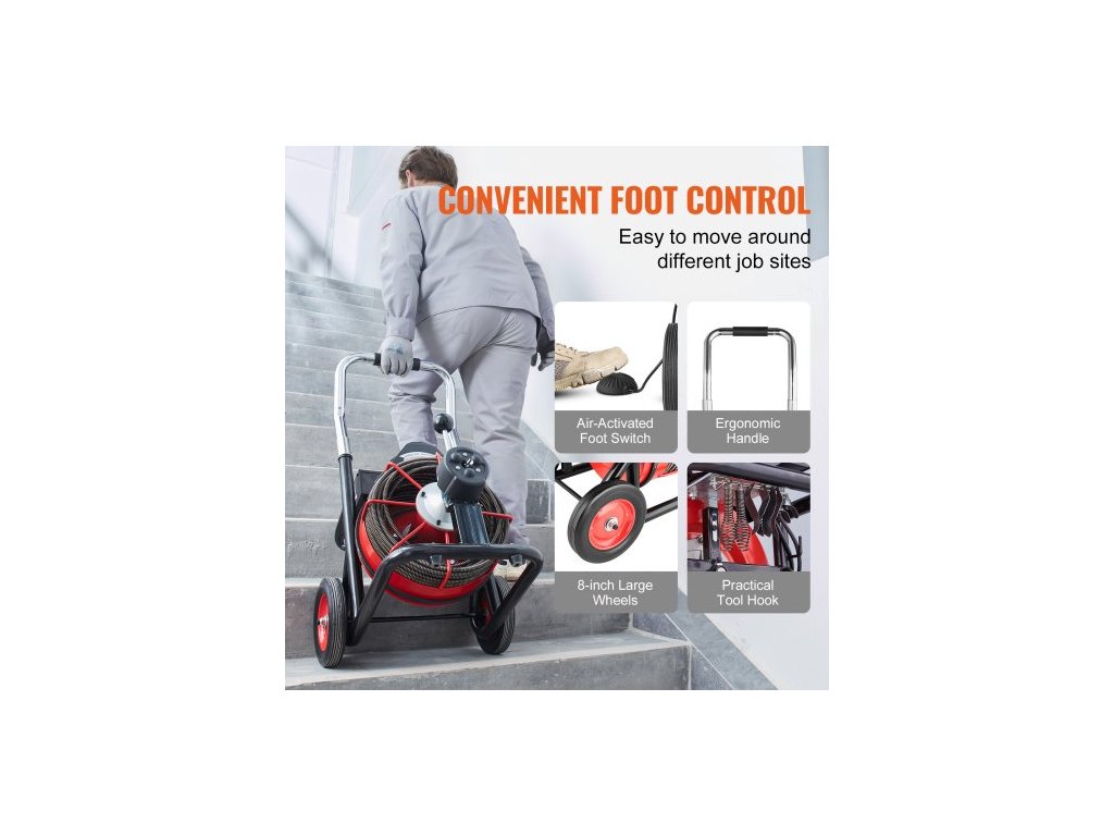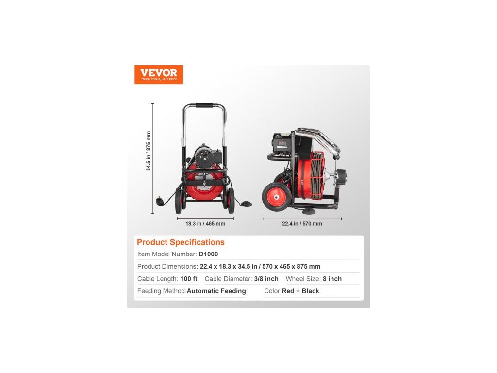 Velikost koleček: 8 palců, Barva: Červená + černá, Číslo modelu položky: D1000, Způsob podávání: Automatické podávání, Průměr kabelu: 3/8 palce, Délka kabelu: 100 stop, Rozměry výrobku: 22,4 x 18,3 x 34,5 palce / 570 x 465 x 875 mm, Čistá hmotnost: 84,44 liber / 38,3 kg (včetně veškerého příslušenství)