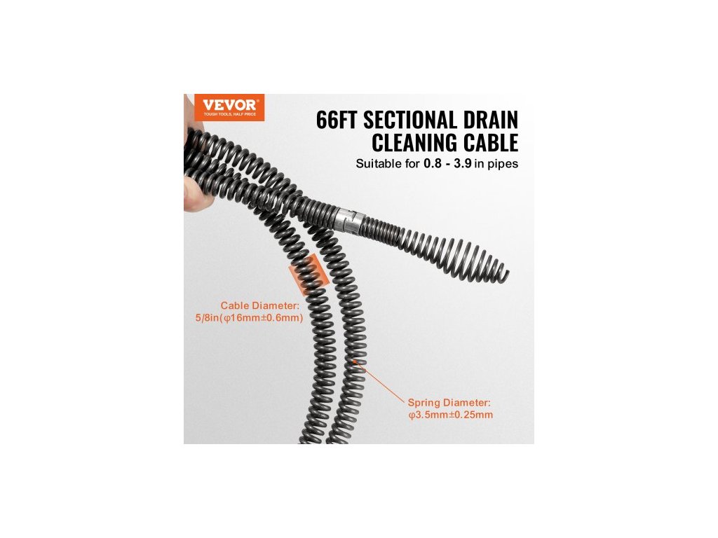 Průměr pružiny: φ3,5 mm±0,25 mm,Použitelná velikost potrubí: 0,8 - 3,9 palce/20-100 mm,Číslo modelu položky: 66 stop*5/8,Průměr kabelu: 5/8 palce (φ16 mm±0,6 mm),Délka kabelu: 66 stop,Rozměry produktu: 15,6 x 15,6 x 4,6 palce / 395 x 395 x 117 mm,Čistá hmotnost: 26,7 lbs / 12,1 kg, hlavní materiál: 65Mn