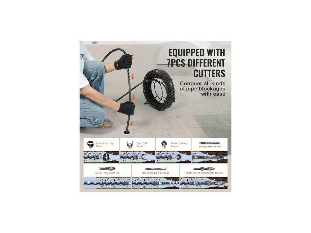 Čisticí šňůra pro sekční čištění odpadů 66 stop/20,1 m x 5/8 palce/1,6 cm a 7 řezných kleští pro trubky o průměru 0,8"-3,9"/2-10 cm