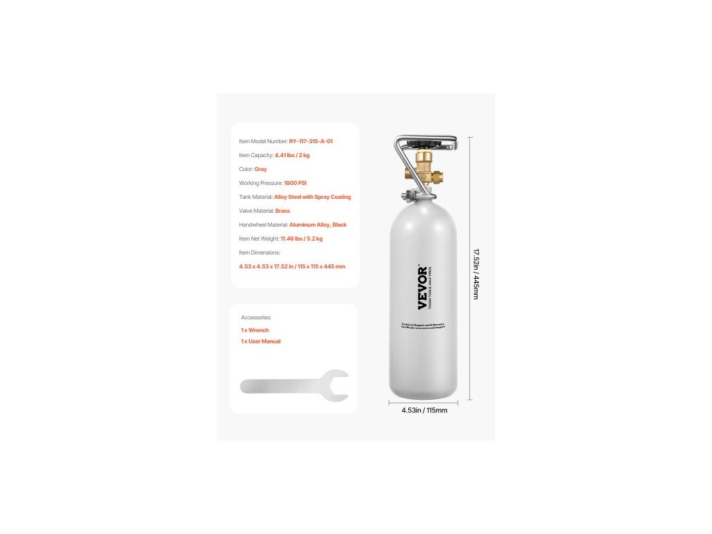 Provozní tlak: 1800 PSI Konstrukce, Funguje <3000 PSI, Barva: Šedá, Číslo modelu položky: RY-117-315-A-01, Materiál ručního kola: Hliníková slitina, černá, Čistá hmotnost položky: 11,46 lbs / 5,2 kg, Rozměry položky: 4,53 x 4,53 x 17,52 palce / 115 x 115 x 445 mm, Materiál nádrže: Legovaná ocel s nástřikem, Kapacita položky: 4,41 lbs / 2 kg, Materiál ventilu: Mosaz