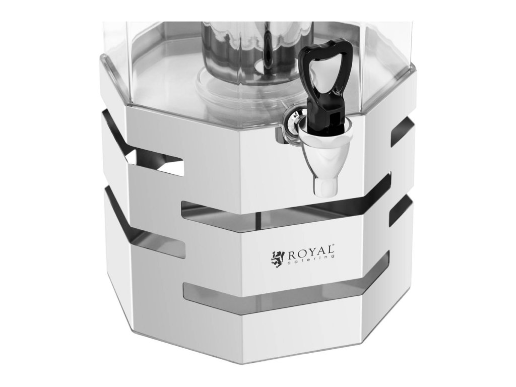 Dávkovač nápojů značky společnosti Royal Catering – stylový a účinný Kvalitní dávkovač nápojů RCSD-3A1 značky Royal Catering by neměl chybět na žádném místě, kde se hostům formou samoobsluhy nabízí voda, ledový čaj či ovocný džus – ať již v rámci snídaňovém bufetu v hotelu, restauraci nebo soukromé oslavě na zahradě. Přístroj umožňuje dle potřeby snadno a efektivně chladit obsah zásobníků o objemu 3 x 3,5 l. Zároveň třípatrová konstrukce v elegantním designu neskutečně poutá pozornost. Ledově vychlazené nápoje, aniž by došlo k jejich zředění! Celý dávkovač na nápoje se skládá z odolných a chuťově neutrálních materiálů. Osmiúhelníkové zásobníky o průměru 23,5 cm do sebe perfektně zapadají, proto je lze stabilně naskládat na lesklý stojan z ušlechtilé oceli. Robustní a průhledný plast umožňuje hostům vždy přesně vidět, jaký nápoj se podává, a Vy jako hostitel naopak uvidíte, kdy je potřeba obsah doplnit. To je mimochodem velmi snadné – zvedněte víko a můžete dolít tekutinu bez toho, aniž by něco stříkalo okolo. Kromě toho je materiál nádob velmi odolný vůči poškrábání a snadno se čistí. Praktická věc: Tři nepropustné nádobky z ušlechtilé oceli pojmou 0,8 l kostek ledu každá a zajišťují rovnoměrné chlazení nabízených nápojů, aniž by roztavený led nápoje ředil. Tak si mohou hosté chlazené nápoje skutečně vychutnat. Díky 3 snadno ovladatelným kohoutkům si mohou z chladiče nápojů načepovat džus či ledový čaj i děti, aniž by při tom něco pobryndaly. Navíc díky vysoké rychlosti, kterou kohoutky nápoje vypouští, nehrozí, že by vznikaly fronty čekajících hostů. Maximální výška skleniček či kelímků, které se vejdou pod nejnižší kohoutek, činí 17 cm a vyhovuje obvyklým rozměrům sklenic. Protiskluzové gumové nožičky zajišťují stabilitu a také chrání plochu, na němž přístroj stojí. Neváhejte a objednejte si stylový dávkovač nápojů ještě dnes.Doplňkové parametry