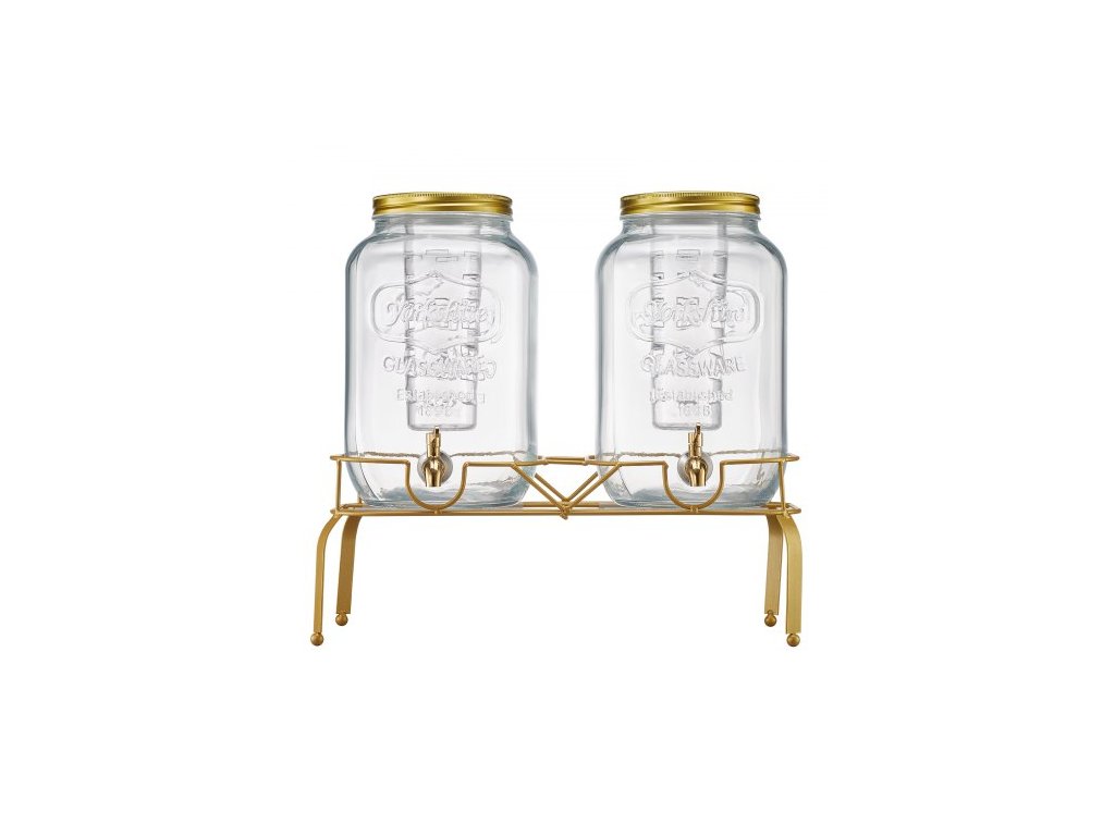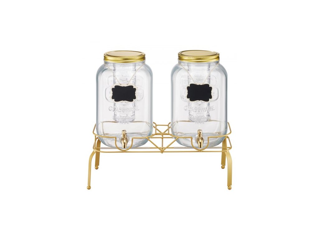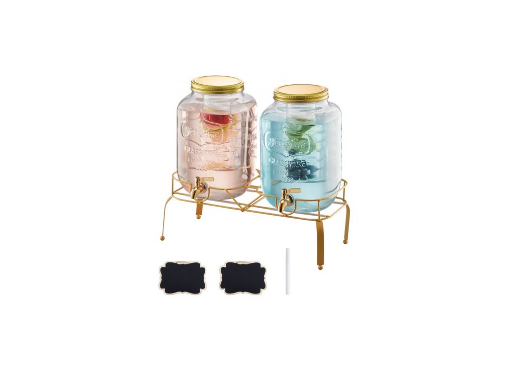 Dávkovač nápojů , balení 2 ks 8l dávkovačů nápojů na večírky, skleněný dávkovač džusu s kovovým stojanem, kohout z nerezové oceli, nálevník, dávkovač ledového čaje, limonády a džusu na vodu na večírky