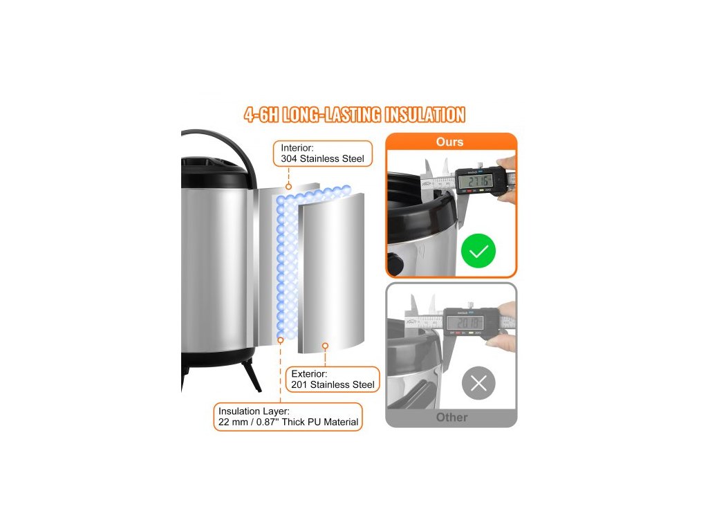 Dávkovač nápojů z nerezové oceli s izolací, 2 galony 7,6 litru, termální dávkovač horkých a studených nápojů s kohoutkem, potravinářský pro horký čaj, kávu, vodu, restauraci, obchod s nápoji