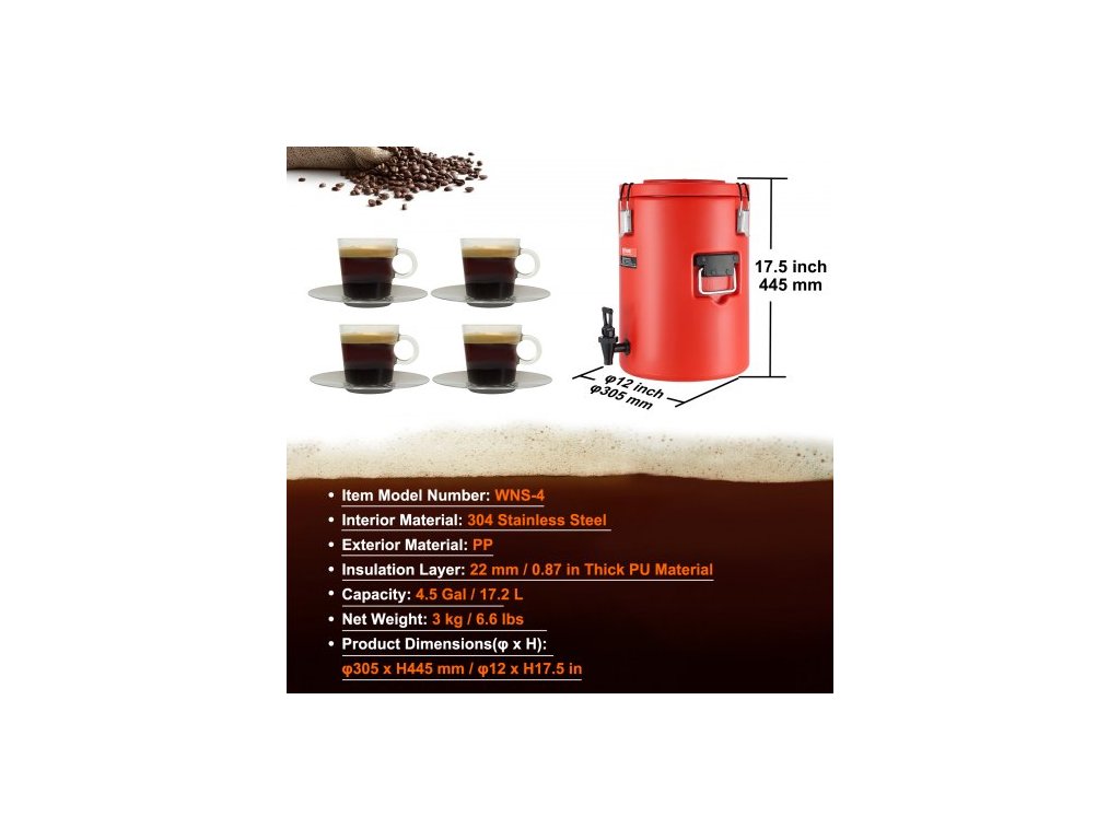 Objem: 4,5 galonu / 17,2 l,Číslo modelu: WNS-4,Izolační vrstva: 22 mm / 0,87 palce silný PU materiál,Rozměry produktu (φ x V): φ305 x V445 mm / φ12 x V17,5 palce,Vnější materiál: PP,Čistá hmotnost: 3 kg / 6,6 lbs,Vnitřní materiál: Nerezová ocel 304