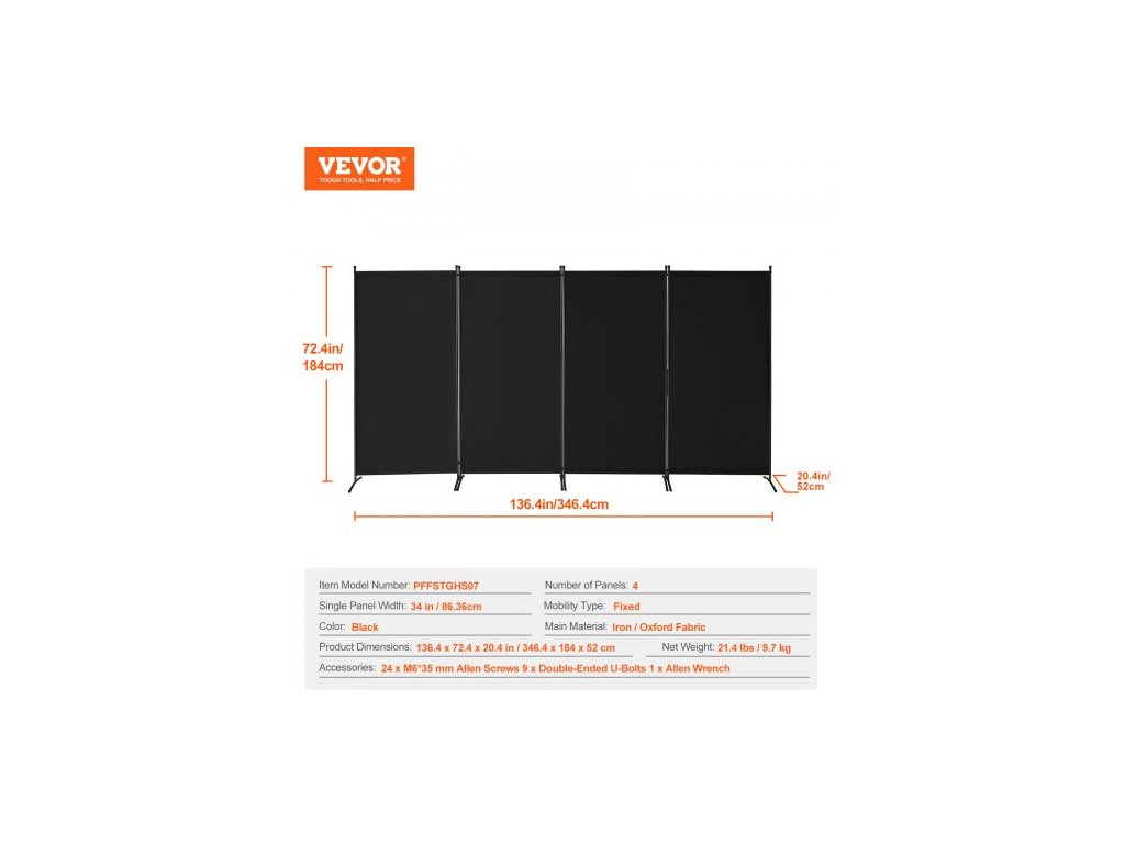 Typ mobility: Pevná,Šířka jednoho panelu: 34 palců / 863,6 mm,Počet panelů: 4,Barva: Černá,Číslo modelu položky: PFFSTGHS07,Rozměry produktu: 136,4 x 72,4 x 20,4 palců / 3464 x 1840 x 520 mm,Čistá hmotnost: 21,4 lbs / 9,7 kg,Hlavní materiál: Železo / oxfordská látka