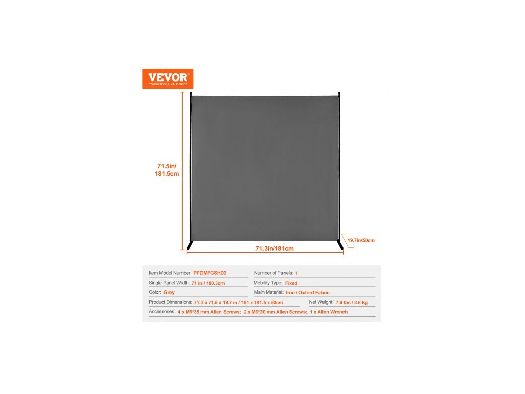 Typ mobility: Pevná, Šířka jednoho panelu: 1803,4 mm, Počet panelů: 1, Barva: Šedá, Číslo modelu položky: PFDMFGSH02, Rozměry produktu: 1810 x 1815 x 500 mm, Čistá hmotnost: 3,6 kg, Hlavní materiál: Železo / oxfordská tkanina