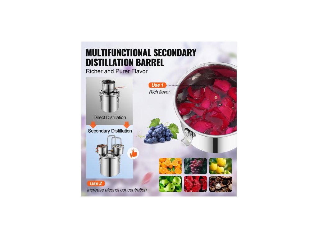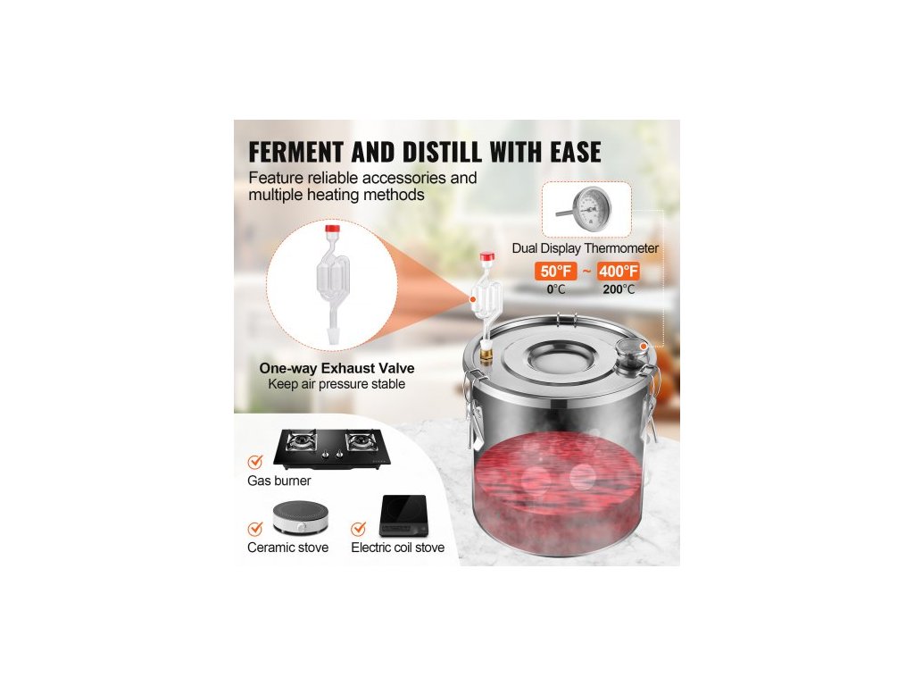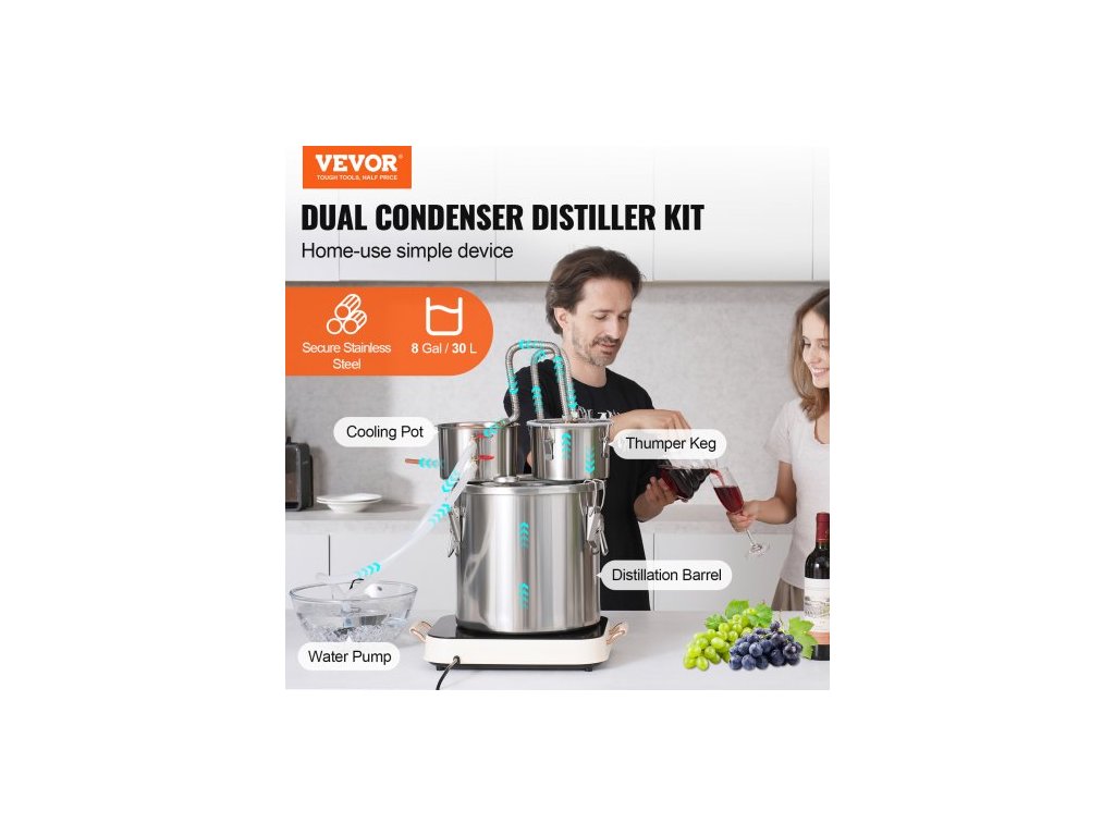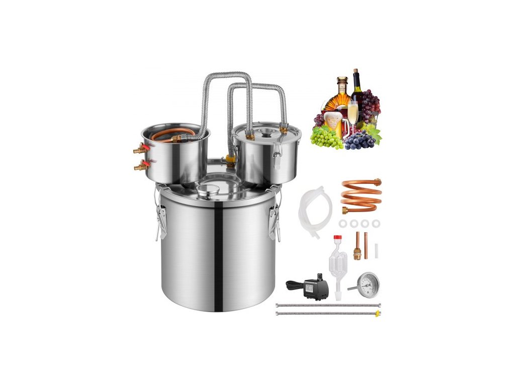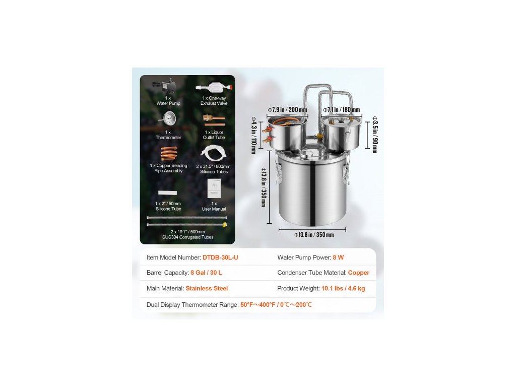 Objem fermentačního sudu: 8 galonů / 30 l,Materiál kondenzační trubky: měď,Výkon vodního čerpadla: 8 W,Číslo modelu položky: DTDB-30L-U,Hmotnost výrobku: 10,1 lbs / 4,6 kg,Rozsah teploměru s dvojitým displejem: 50°F~400°F / 0℃~200℃,Hlavní materiál: nerezová ocel SUS201