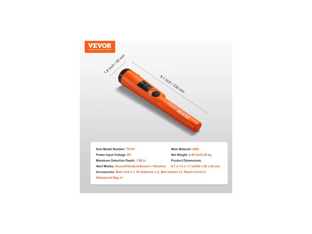 Číslo modelu: TS101, Maximální hloubka detekce: 1,96 palce, Rozměry výrobku: 9,1 x 1,8 x 1,7 palce/230 x 45 x 42 mm, Režimy upozornění: Zvuk/Vibrace/Zvuk + Vibrace, Čistá hmotnost: 0,64 lbs/0,29 kg, Vstupní napětí: 9V, Hlavní materiál: ABS