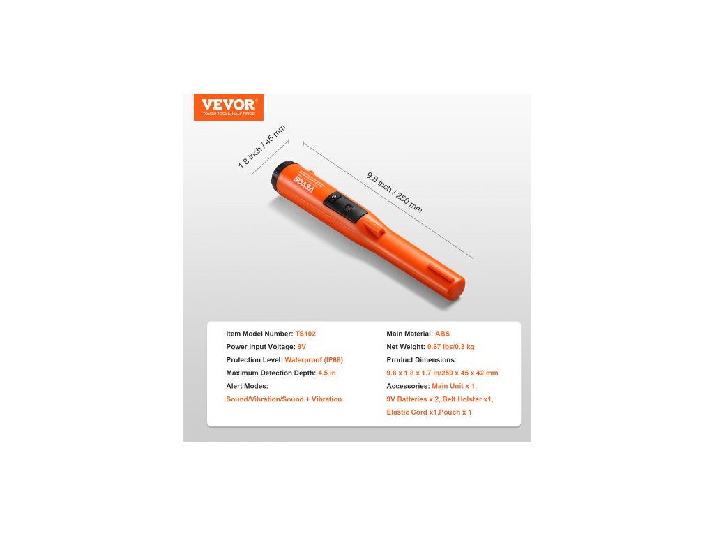 Úroveň ochrany: Plně vodotěsný (IP68), Číslo modelu položky: TS102, Maximální hloubka detekce: 4,5 palce, Rozměry produktu: 9,8 x 1,8 x 1,7 palce/250 x 45 x 42 mm, Režimy upozornění: Zvuk/Vibrace/Zvuk + Vibrace, Čistá hmotnost: 0,67 lbs/0,3 kg, Vstupní napětí: 9V, Hlavní materiál: ABS