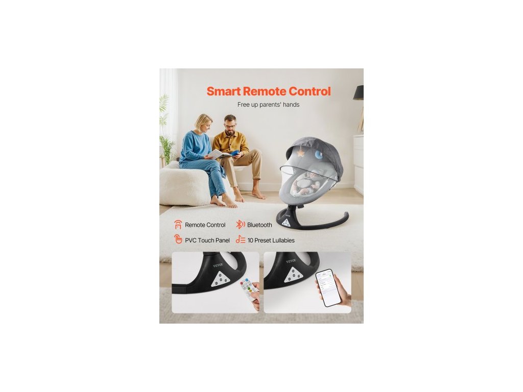 Dětská houpačka , 5stupňová houpačka pro miminka se 3 polohami sedáku, přenosná dětská houpačka s dotykovým PVC panelem, dálkové ovládání, Bluetooth, 10 ukolébavkami a moskytiérou pro novorozence 0-9 měsíců/0-20 kgVáš chytrý uklidňující pomocník pro miminka