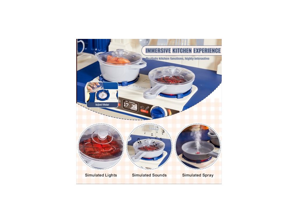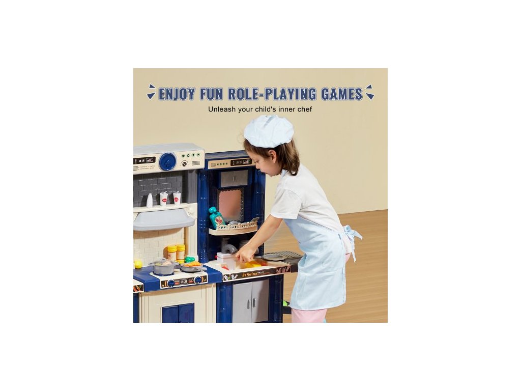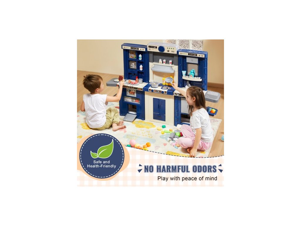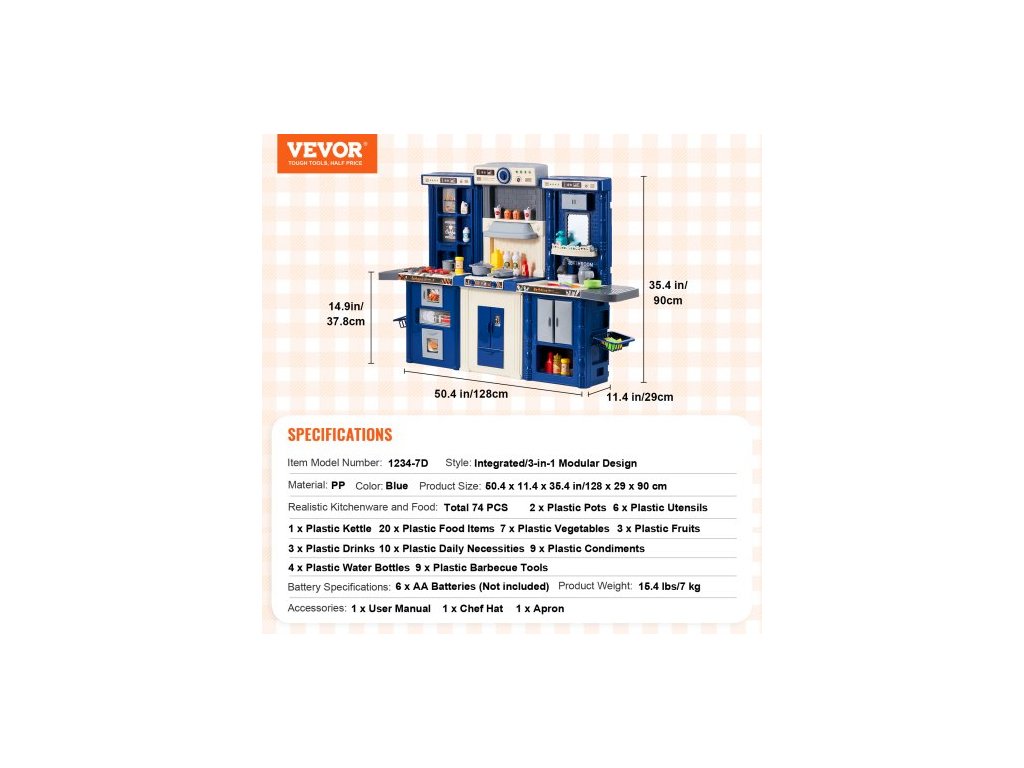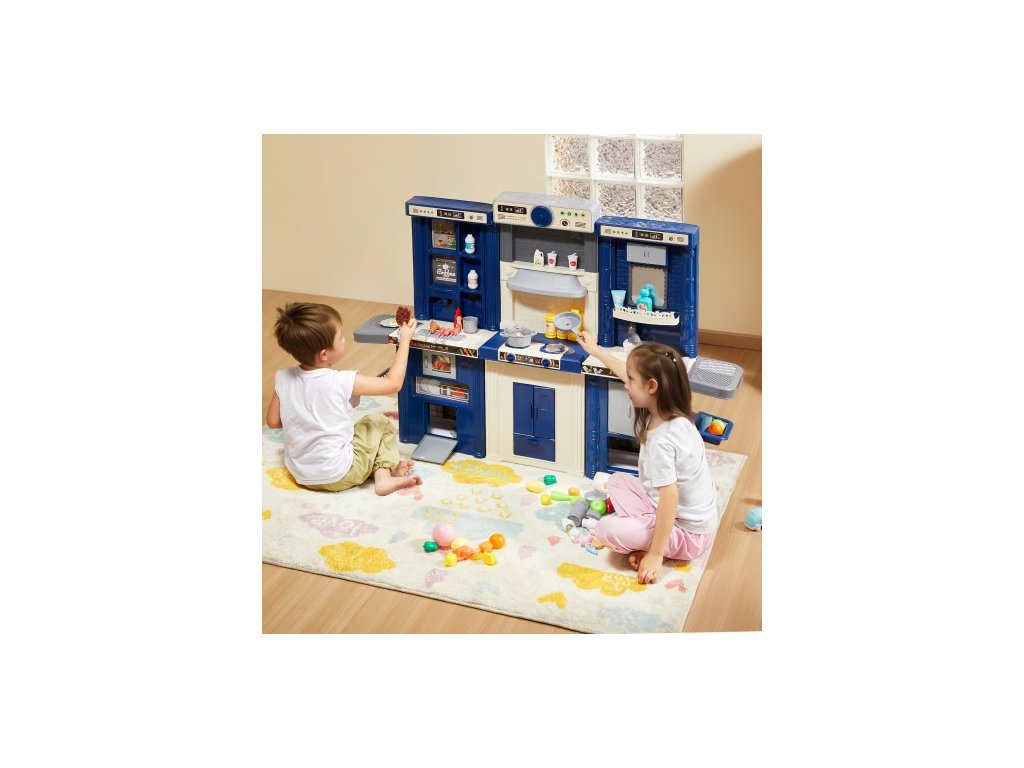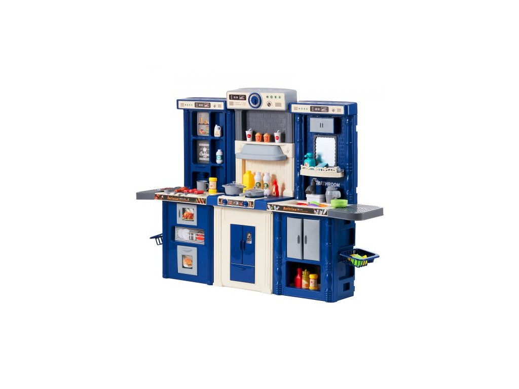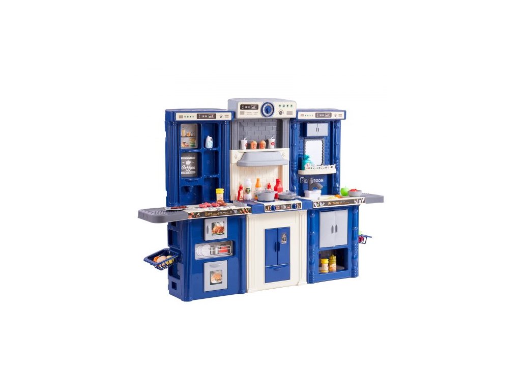 Barva: Modrá, Číslo modelu položky: 1234-7D, Hmotnost výrobku: 7 kg, Styl: Modulární designová herní kuchyňka 3 v 1, Realistické kuchyňské nádobí a jídlo: 74 dílů, Materiál: PP, Specifikace baterií: 6 x AA baterie (nejsou součástí balení), Rozměry výrobku: 128 x 29 x 90 cm