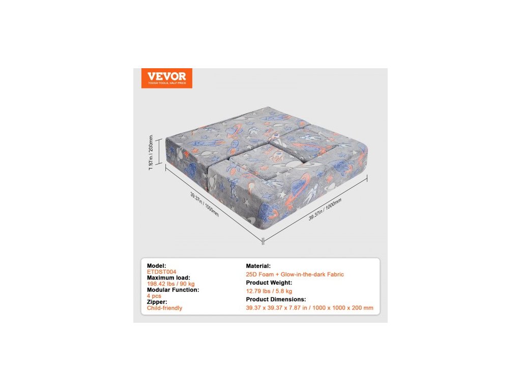 Maximální zatížení: 90 kg,Modulární funkce: 4 ks,Pěna: 1000 x 500 x 200 mm (2 ks),Model: ETDST004,Hmotnost výrobku: 5,8 kg,Materiál: 25D pěna + látka svítící ve tmě,Zip: Vhodný pro děti,Rozměry výrobku: 39,37 x 39,37 x 7,87 1000 x 1000 x 200 mm, 350 x 350 x 200 mm (2 ks):