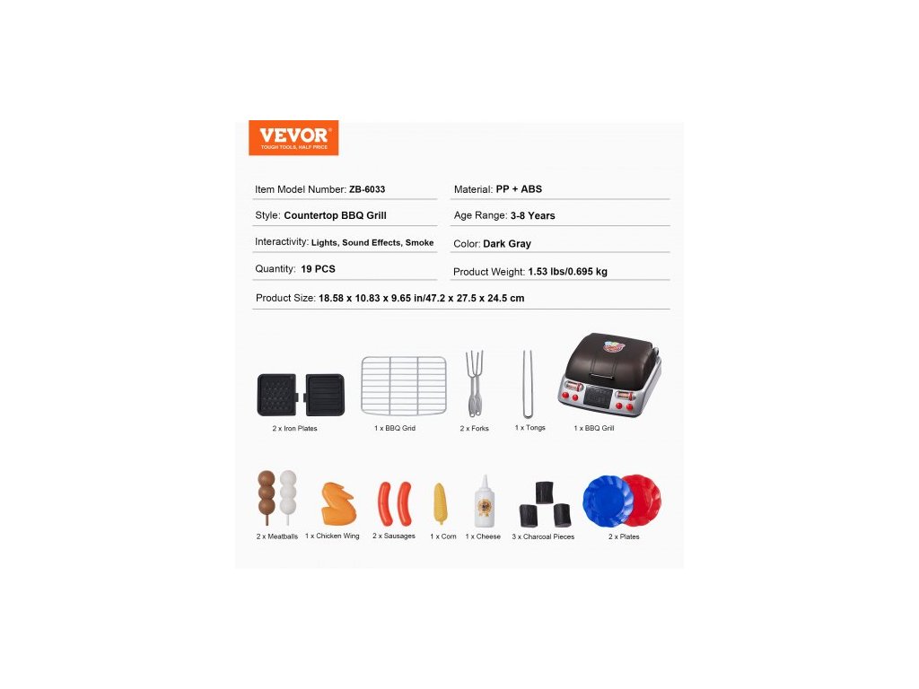 Věkové rozmezí: 3-8 let, Barva: Tmavě šedá, Číslo modelu položky: ZB-6033, Hmotnost výrobku: 1,53 lbs/0,695 kg, Styl: Stolní gril, Množství: 19 ks, Materiál: PP + ABS, Interaktivita: Světla, Zvukové efekty, Kouř, Velikost výrobku: 18,58 x 10,83 x 9,65 palce/47,2 x 27,5 x 24,5 cm