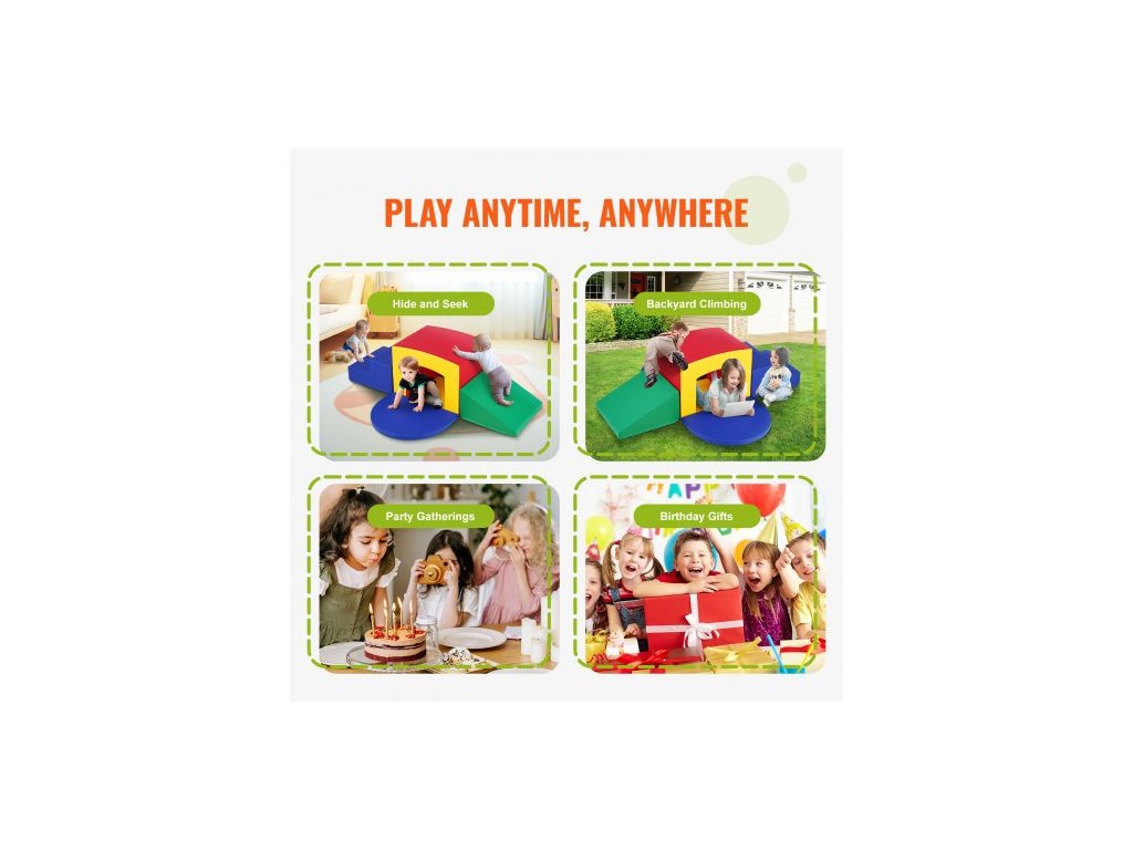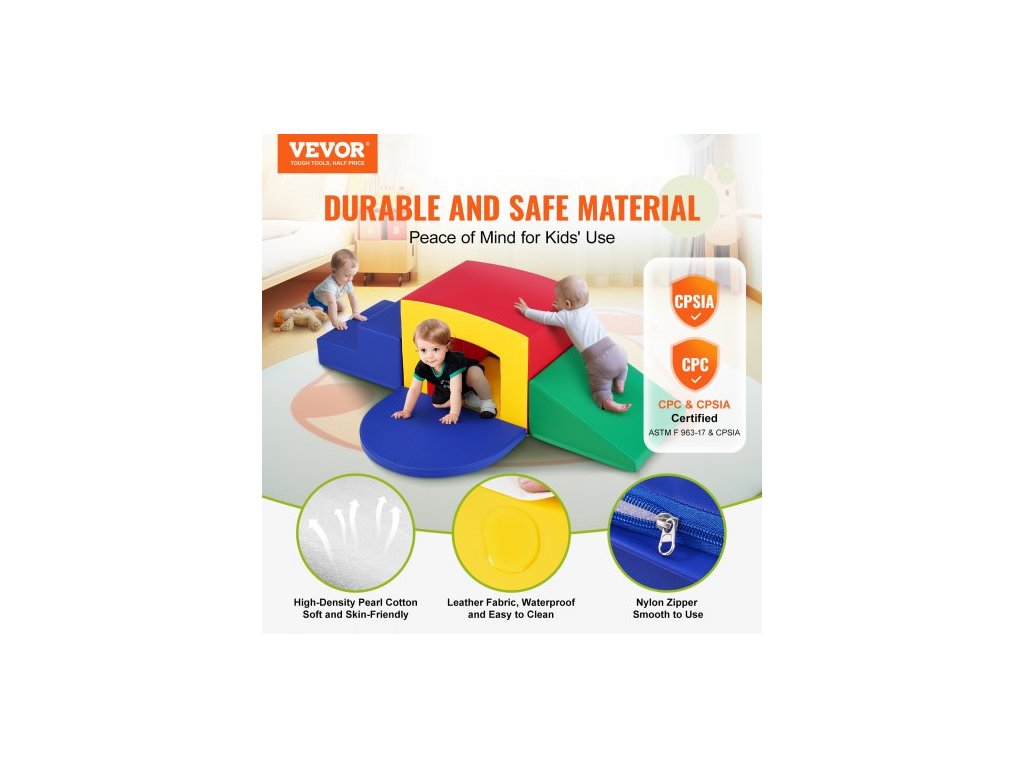 Vhodné pro děti od 3 let, Hlavní materiály: perleťová bavlna, kožená tkanina, nylonový zip, Počet montážních dílů: 5 kusů, Rozměry rampy: 17,7x18,1x10''/450x460x254 mm, Rozměry schodů: 17,9x18,1x10''/455x460x255 mm, Rozměry tenké podložky 2: 24,2x18,1x1,5''/615x460x38 mm, Rozměry tenké podložky 1: 24,2x18,1x1,5''/615x460x38mm,Model: GLB-002,Rozměry tunelu: 23,6x17,9x18,1''/600x455x460mm,Čistá hmotnost: 10 lbs / 4,55 kg