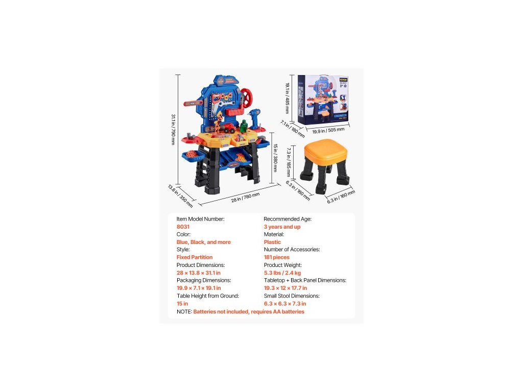 Doporučený věk: 3 roky a více,Barva: Modrá, černá a další,Materiál: Plast,Rozměry výrobku: 28 x 13,8 x 31,1 palce / 710 x 350 x 790 mm,Počet příslušenství: 181 dílků,Rozměry malé stoličky: 6,3 x 6,3 x 7,3 palce / 160 x 160 x 185 mm,Rozměry desky stolu + zadního panelu: 19,3 x 12 x 17,7 palce / 490 x 305 x 450 mm,POZNÁMKA: Baterie nejsou součástí balení, vyžaduje baterie AA,Číslo modelu položky: 8031,Hmotnost výrobku: 5,3 lbs / 2,4 kg,Provedení: Pevná přepážka,Výška stolu od země: 15 in / 380 mm,Rozměry balení: 19,9 x 7,1 x 19,1 in / 505 x 180 x 485 mm
