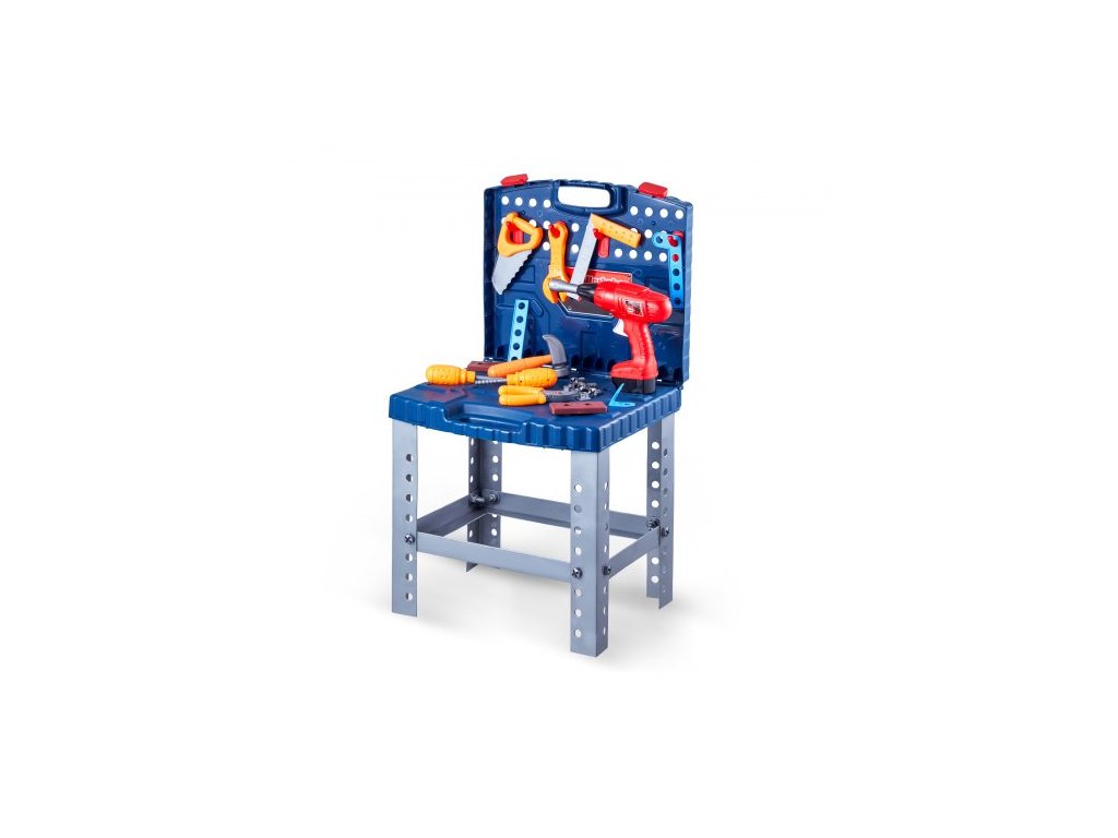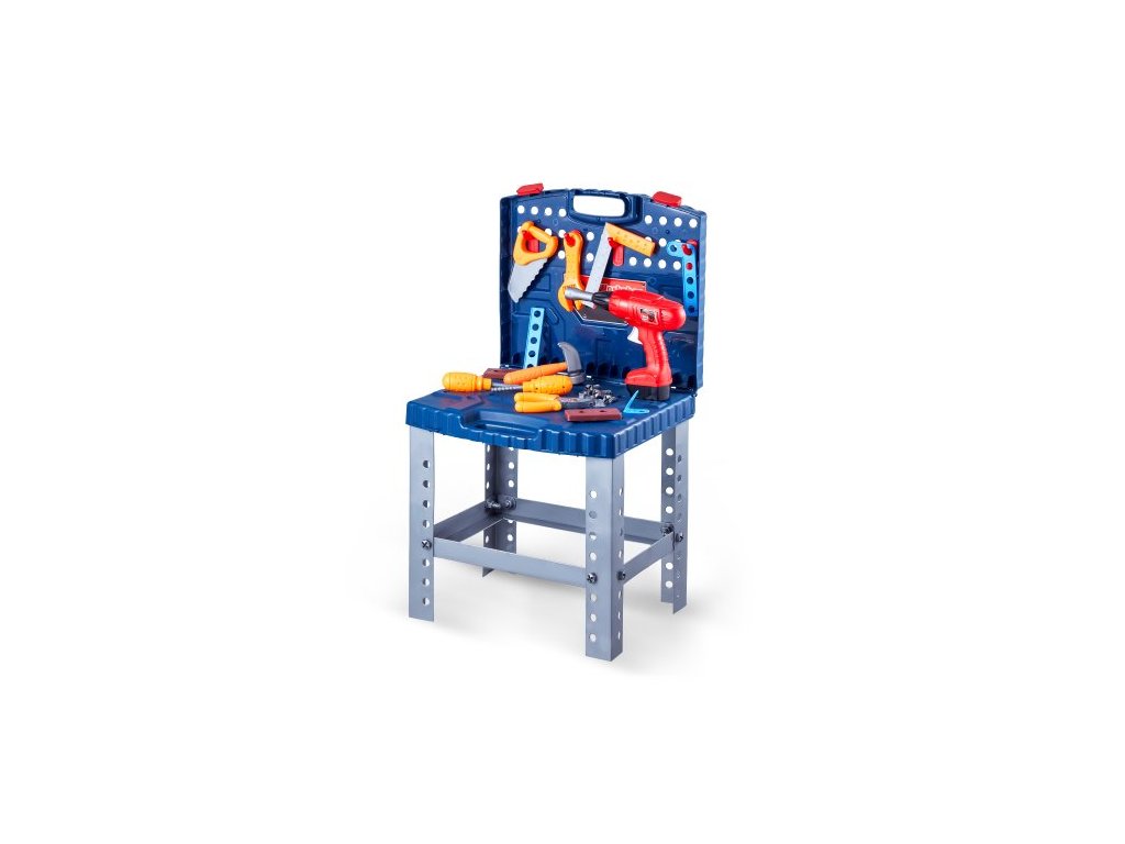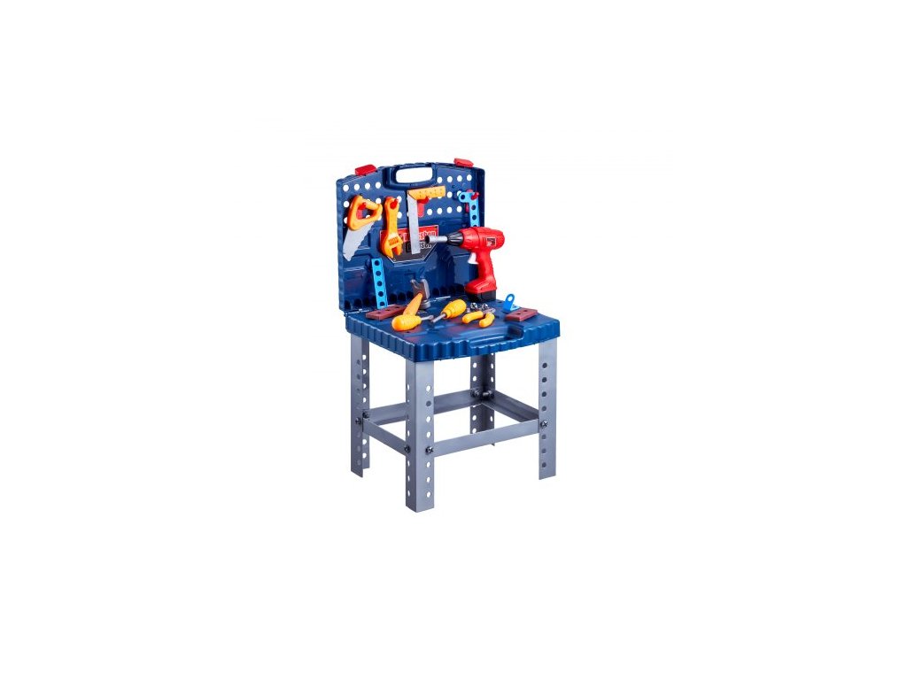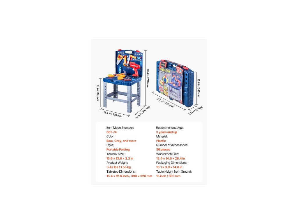 Doporučený věk: 3 roky a více, Barva: Modrá, šedá a další, Velikost pracovního stolu: 15,4 x 14,6 x 28,4 palce / 390 x 370 x 720 mm, Materiál: Plast, Počet příslušenství: 56 dílů, Velikost bedny na nářadí: 15,6 x 13,6 x 3,3 palce / 395 x 345 x 85 mm, Rozměry desky stolu: 15,4 x 12,6 palce / 390 x 320 mm, Číslo modelu položky: 661-74, Hmotnost výrobku: 1,55 kg, Styl: Přenosný skládací, Výška stolu od země: 385 mm, Rozměry balení: 410 x 100 x 375 mm, Rozměry rozloženého nářadí: 395 x 300 x 300 mm