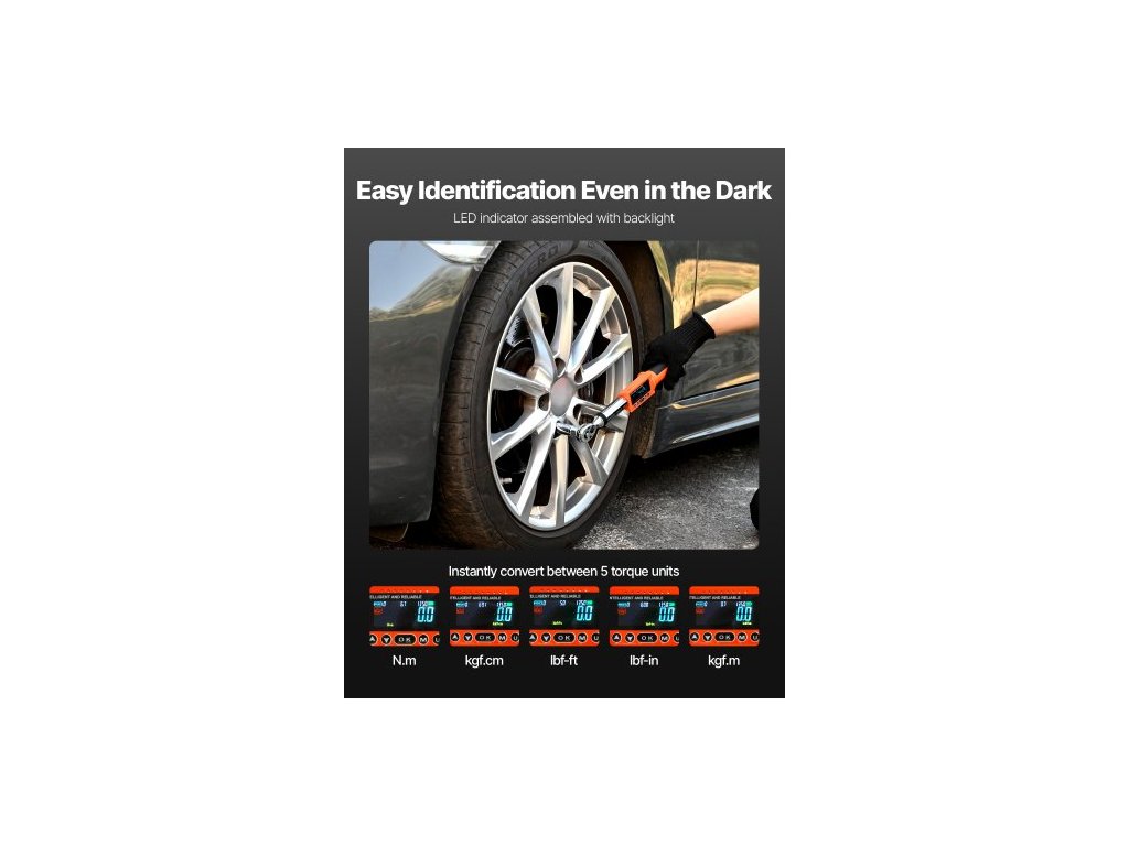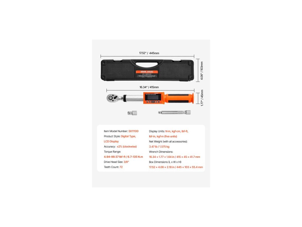 Digitální momentový klíč , pohon 3/8 palce, 0–99,57 lbf-ft / 0–135 N.m, 72 zubů, ±2 %, vysoce přesný elektronický momentový klíč s přednastavenou hodnotou, bzučákem a LED upozorněním, pro automobily a motocykly
