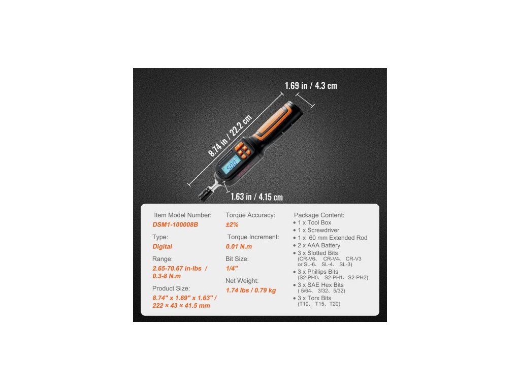 Typ: Digitální, krok momentu: 0,01 N.m, Číslo modelu položky: DSM1-100008B, Přesnost momentu: ±2 %, Rozsah: 2,65–70,67 in-lbs / 0,3–8 N.m, Velikost bitu: 1/4", Čistá hmotnost: 1,74 lbs / 0,79 kg, Rozměry výrobku: 8,74" x 1,69" x 1,63" / 222 × 43 × 41,5 mm