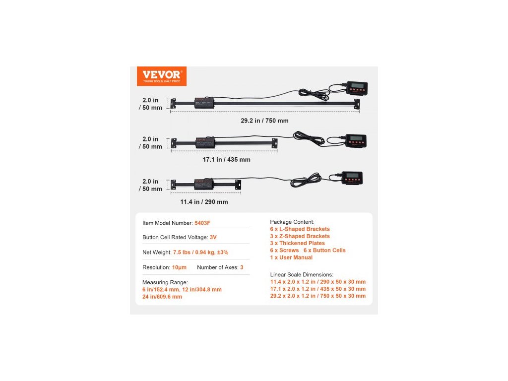 Rozměry lineárního pravítka: 11,4 x 2,0 x 1,2 palce / 290 x 50 x 30 mm; 17,1 x 2,0 x 1,2 palce 435 x 50 x 30 mm; 29,2 x 2,0 x 1,2 palce / 750 x 50 x 30 mm, Počet os: 3, Rozsah měření: 6 palců / 152,4 mm, 12 palců / 304,8 mm, 24 palců / 609,6 mm, Číslo modelu položky: 5403F, Jmenovité napětí knoflíkové baterie: 3 V, Čistá hmotnost: 7,5 lbs / 0,94 kg, ±3 %, Rozlišení: 10 μm