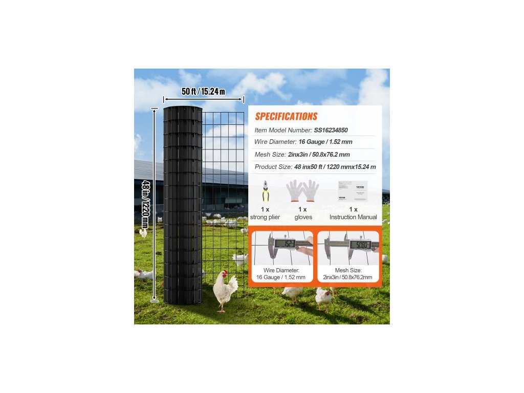 Číslo modelu položky: SS16234850, Čistá hmotnost výrobku: 6,4 kg ±3 %, Povrchová úprava: pozink + černý vinyl, Velikost ok: 2 x 3 palce/50,8 x 76,2 mm, Hlavní materiál: pozinkovaný železný drát + PVC, Průměr drátu: 16 Gauge/1,52 mm, Velikost výrobku: 48 palců x 50 stop/1220 x 15240 mm