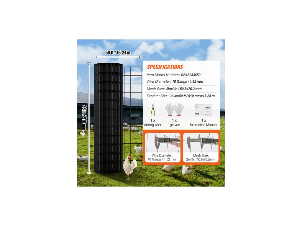 Číslo modelu položky: SS16233650, Čistá hmotnost výrobku: 4,9 kg ±3 %, Povrchová úprava: pozink + černý vinyl, Velikost ok: 2 x 3 palce/50,8 x 76,2 mm, Hlavní materiál: pozinkovaný železný drát + PVC, Průměr drátu: 16 Gauge/1,52 mm, Velikost výrobku: 36 palců x 50 stop/910 x 15240 mm