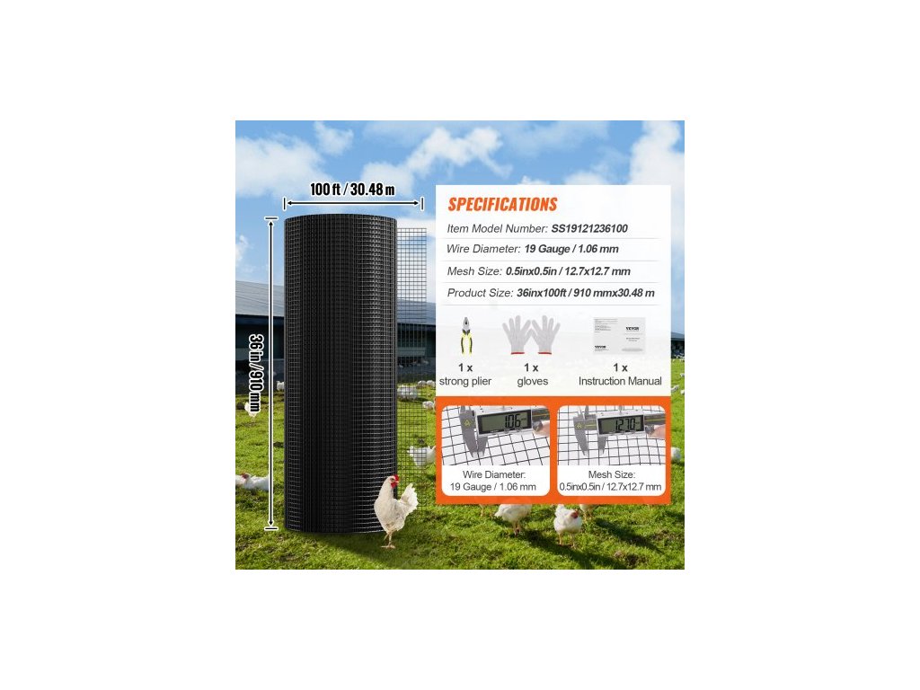 Číslo modelu položky: SS19121236100, Čistá hmotnost výrobku: 17,4 kg ±3 %, Povrchová úprava: pozink + černý vinyl, Velikost ok: 0,5 palce x 0,5 palce/12,7 x 12,7 mm, Hlavní materiál: pozinkovaný železný drát + PVC, Průměr drátu: 19 Gauge/1,06 mm, Velikost výrobku: 36 palců x 100 stop/910 x 30480 mm