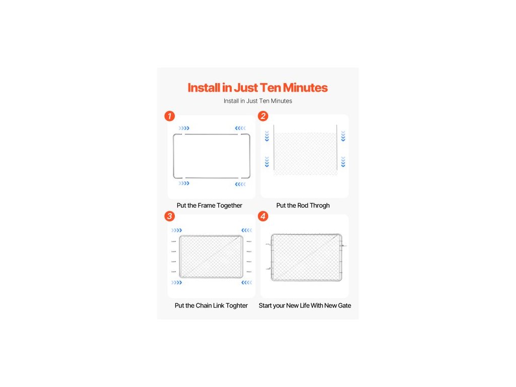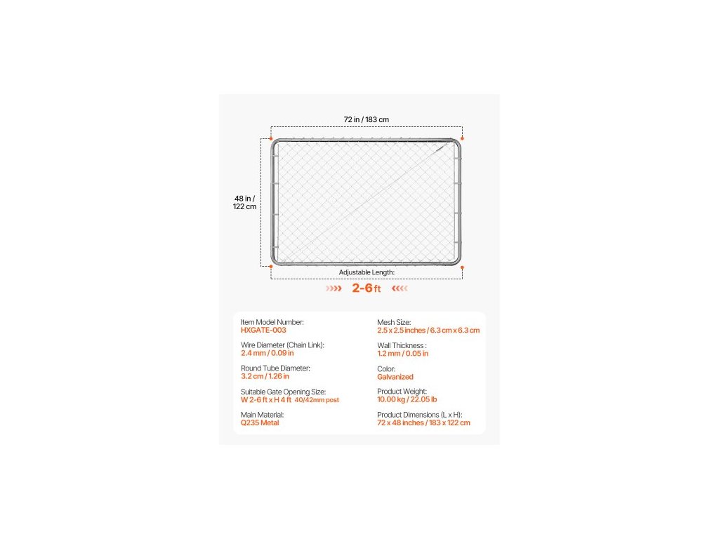 Vhodná velikost brány: Š 2,2-6 stop x V 6 stop,Barva: Pozink,Číslo modelu položky: HXGATE-003,Rozměry brány (D x V): 72 x 48 palců / 183 x 122 cm,Hmotnost výrobku: 10,00 kg / 22,05 lb,Tloušťka stěny: 1,2 mm / 0,05 palce,Průměr drátu (řetízek): 2,4 mm / 0,09 palce, Rozměry produktu: Délka: 1830 mm / 72,05 palce, Výška: 1220 mm / 48,03 palce, Velikost ok: 2,5 x 2,5 palce / 6,3 cm, Průměr kulaté trubky: 3,2 cm / 1,26 palce, Hlavní materiál: Kov Q235