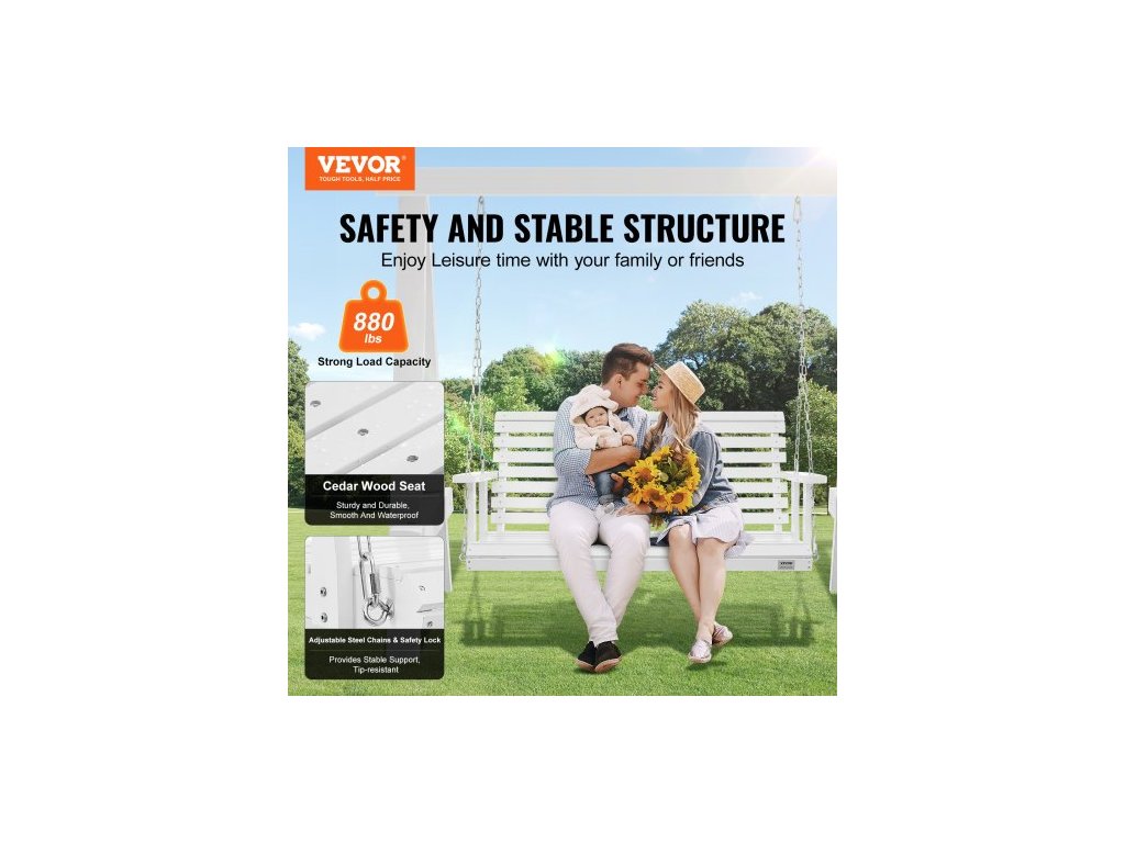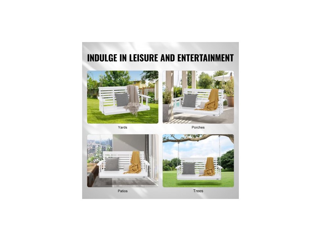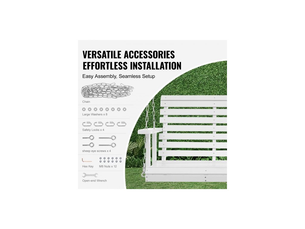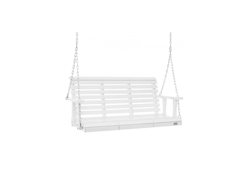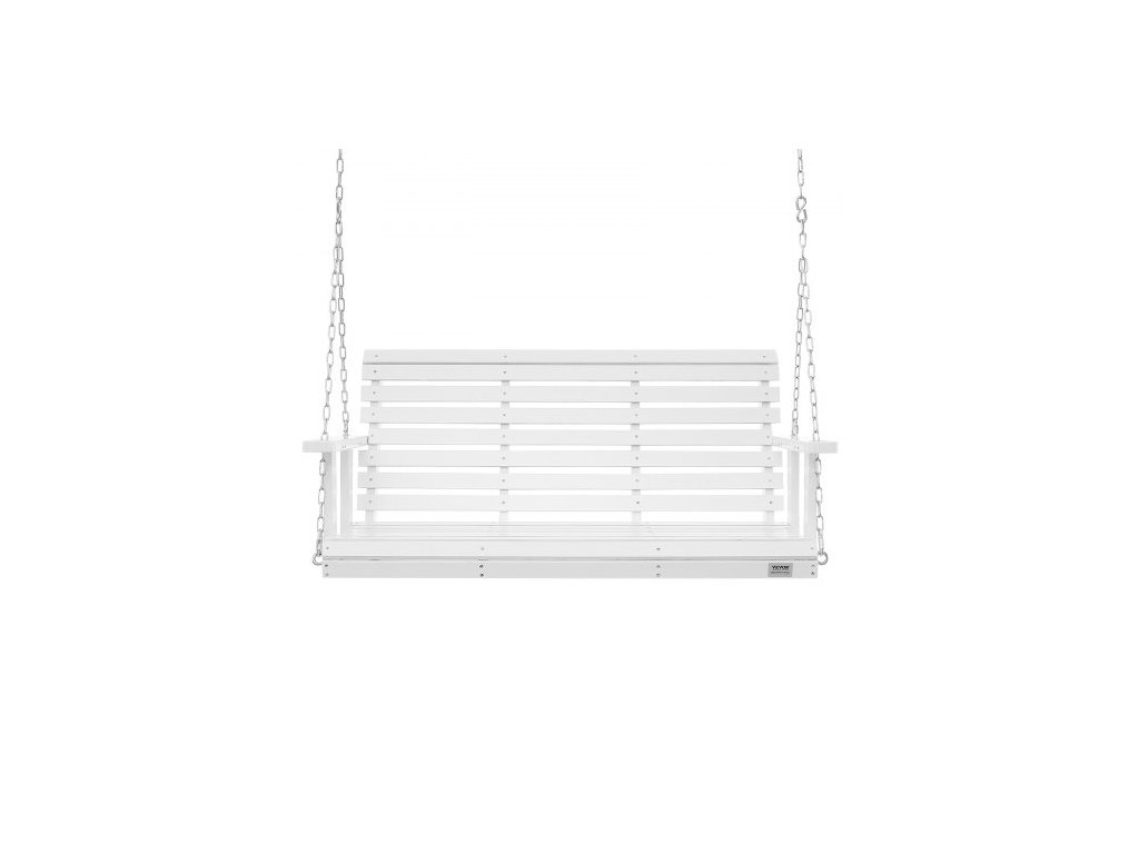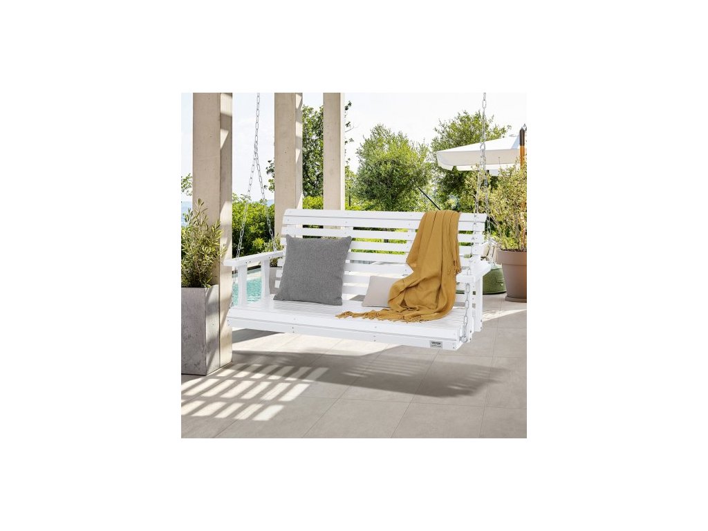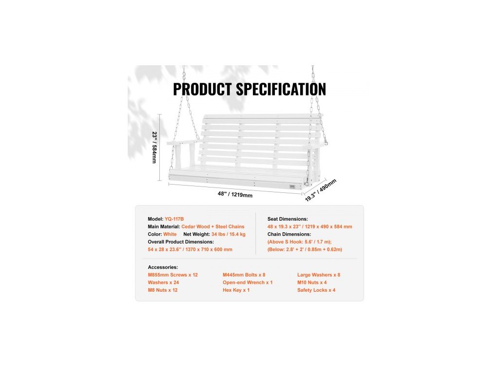 Barva: Bílá,Model: YQ-117B,Rozměry sedáku: 1219 x 490 x 584 mm,Rozměry řetězu: (Nad hákem S: 1,7 m); (Dole: 2,8' x 2 / 0,85 m x 2), Čistá hmotnost: 34 lbs / 15,4 kg, Hlavní materiál: Cedrové dřevo + ocelové řetězy, Celkové rozměry výrobku: 54 x 28 x 23,6'' / 1370 x 710 x 600 mm