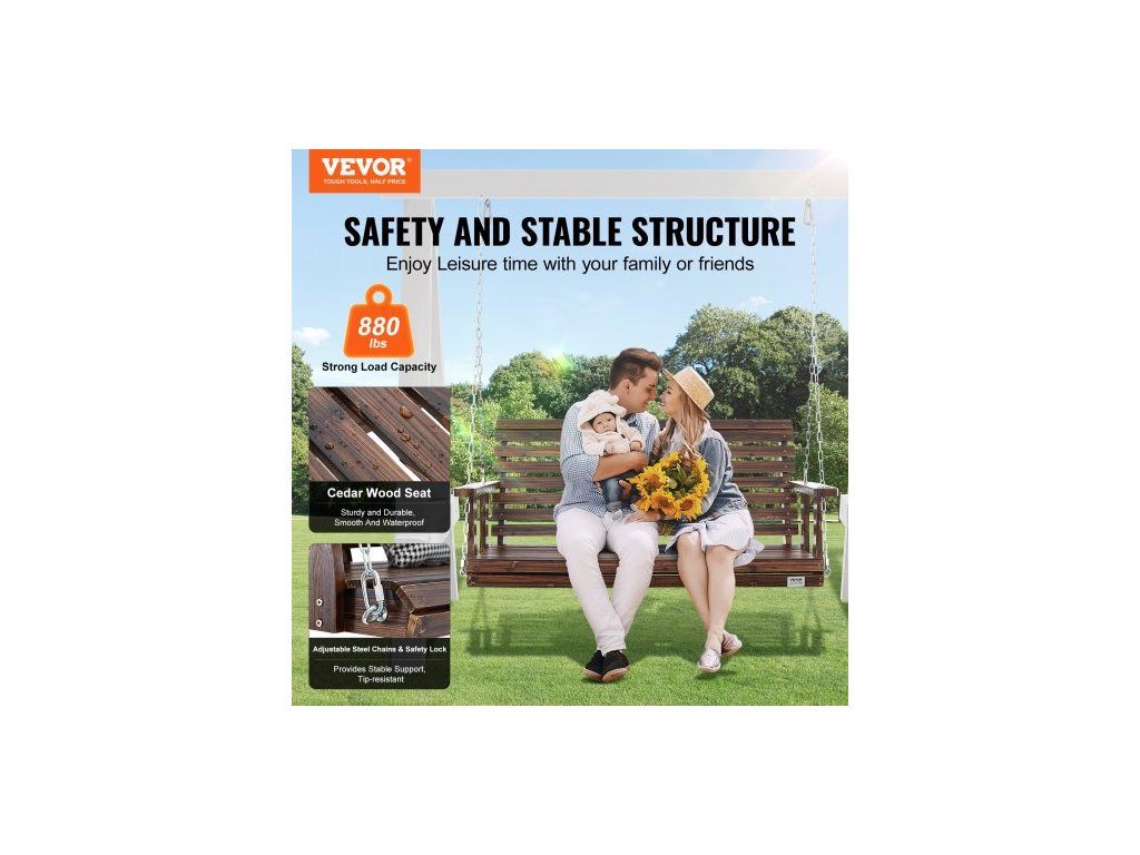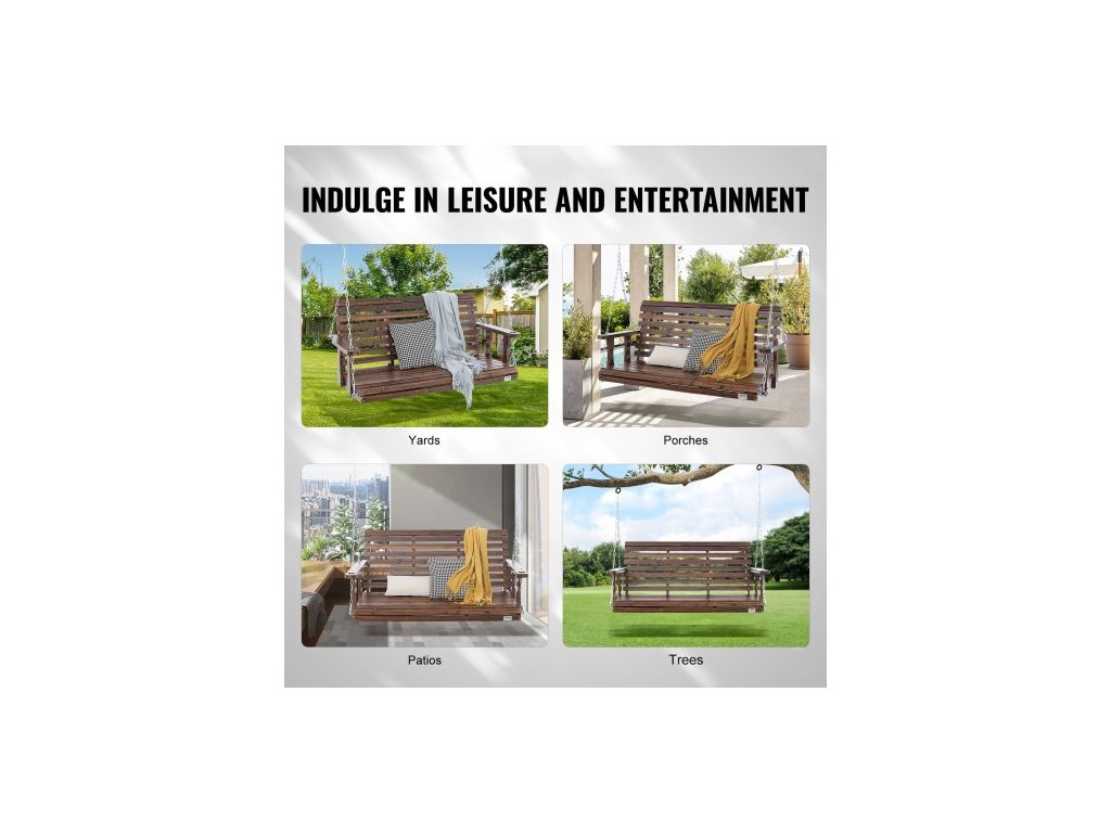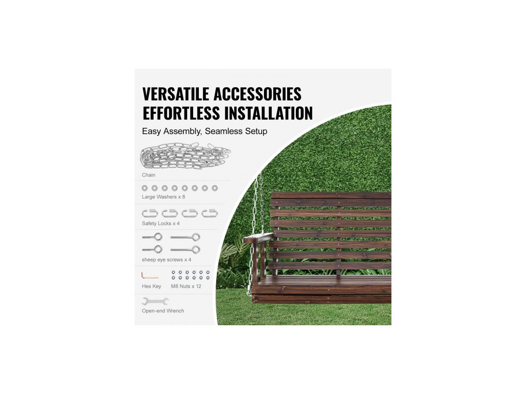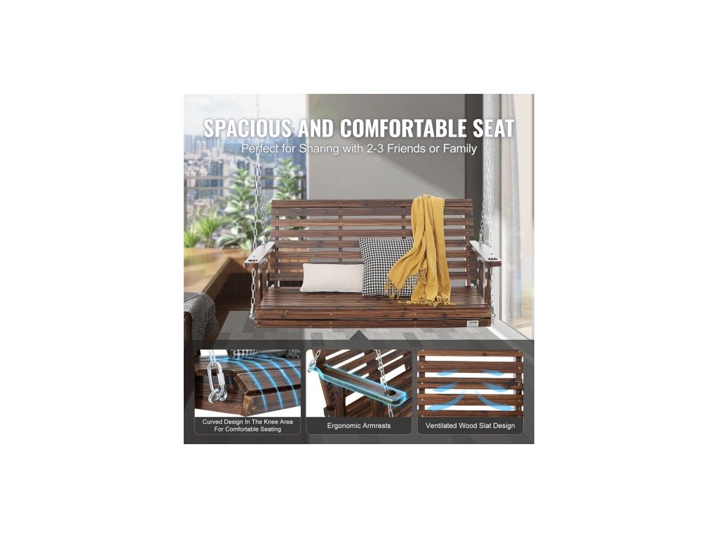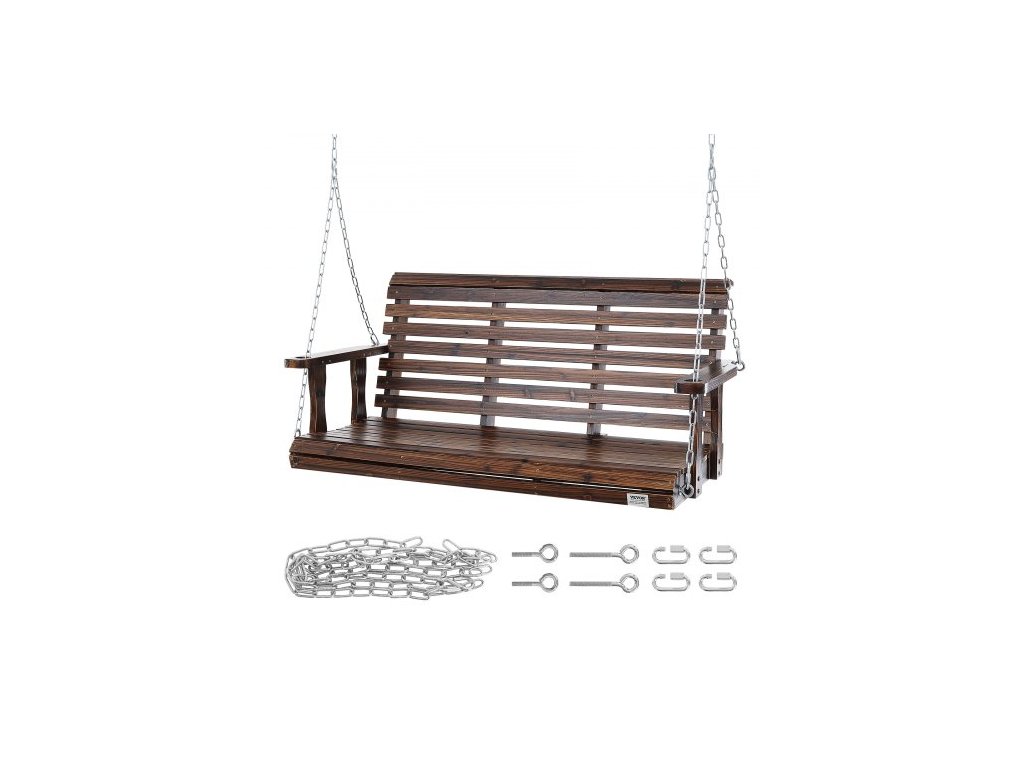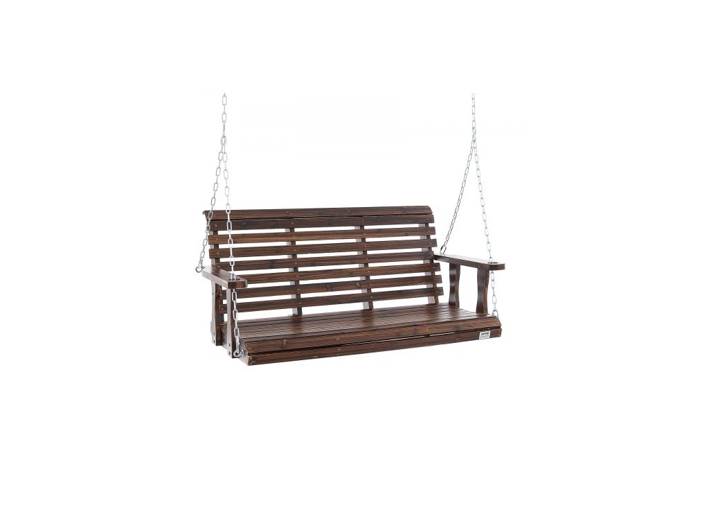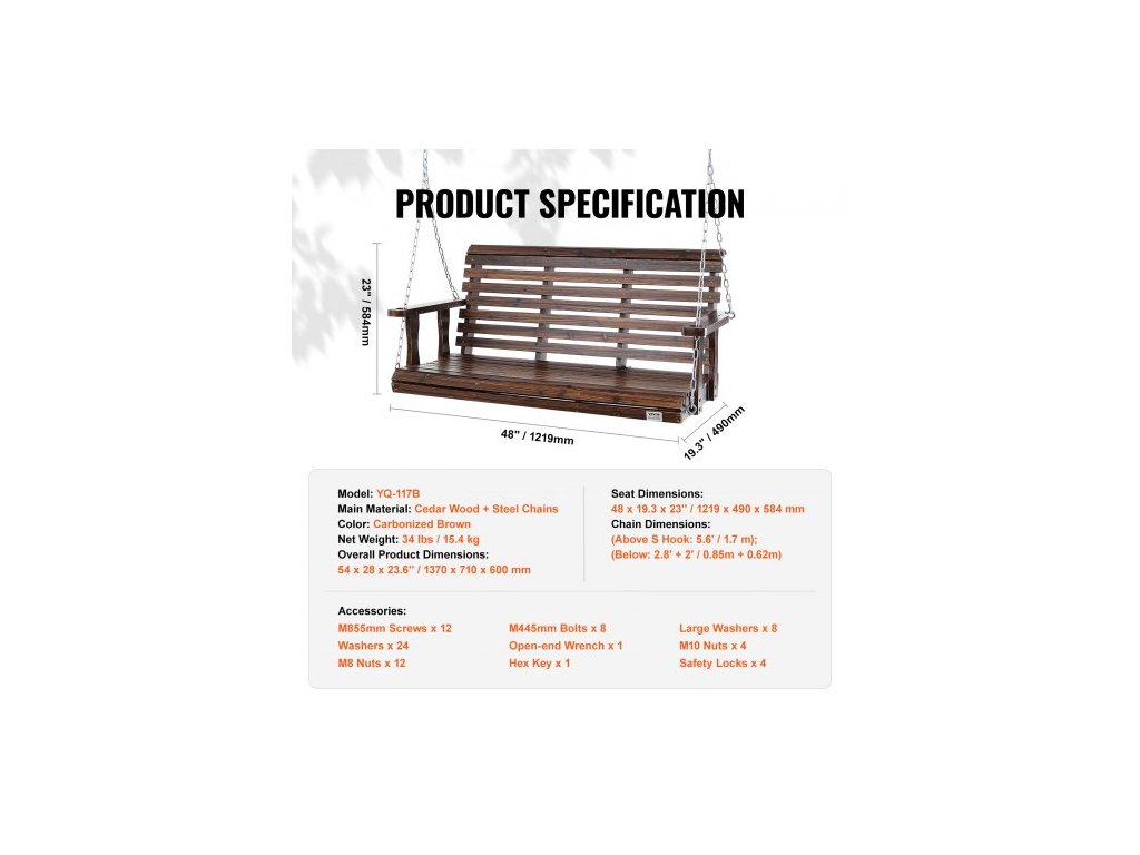 Barva: hnědá s karbonizovanou úpravou, model: YQ-117B, rozměry sedáku: 1219 x 490 x 584 mm, rozměry řetězu: (nad hákem S: 1,7 m); (Dole: 2,8' x 2 / 0,85 m x 2), Čistá hmotnost: 34 lbs / 15,4 kg, Hlavní materiál: Cedrové dřevo + ocelové řetězy, Celkové rozměry výrobku: 54 x 28 x 23,6'' / 1370 x 710 x 600 mm
