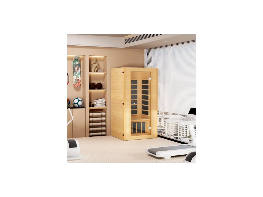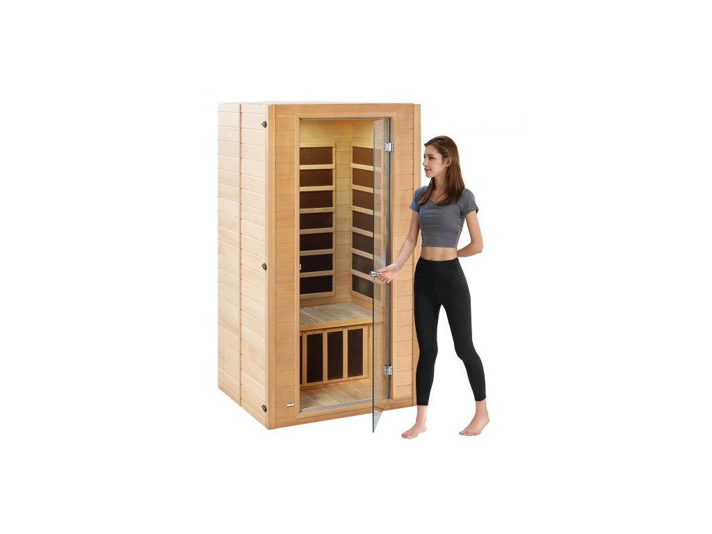 Dřevěná sauna s infračerveným zářením, pokojová domácí sauna pro 1 až 2 osoby, sauna z tvrzeného skla s infračerveným zářením a vícebarevnou lampou, Bluetooth reproduktory a chromoterapeutickými světly.
