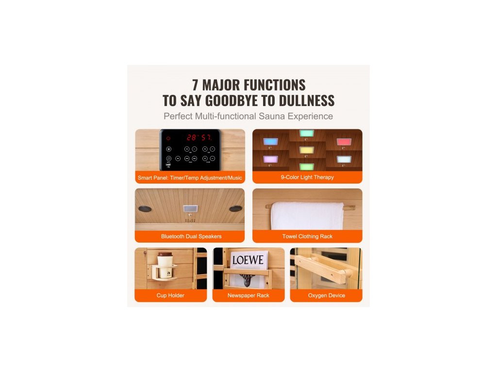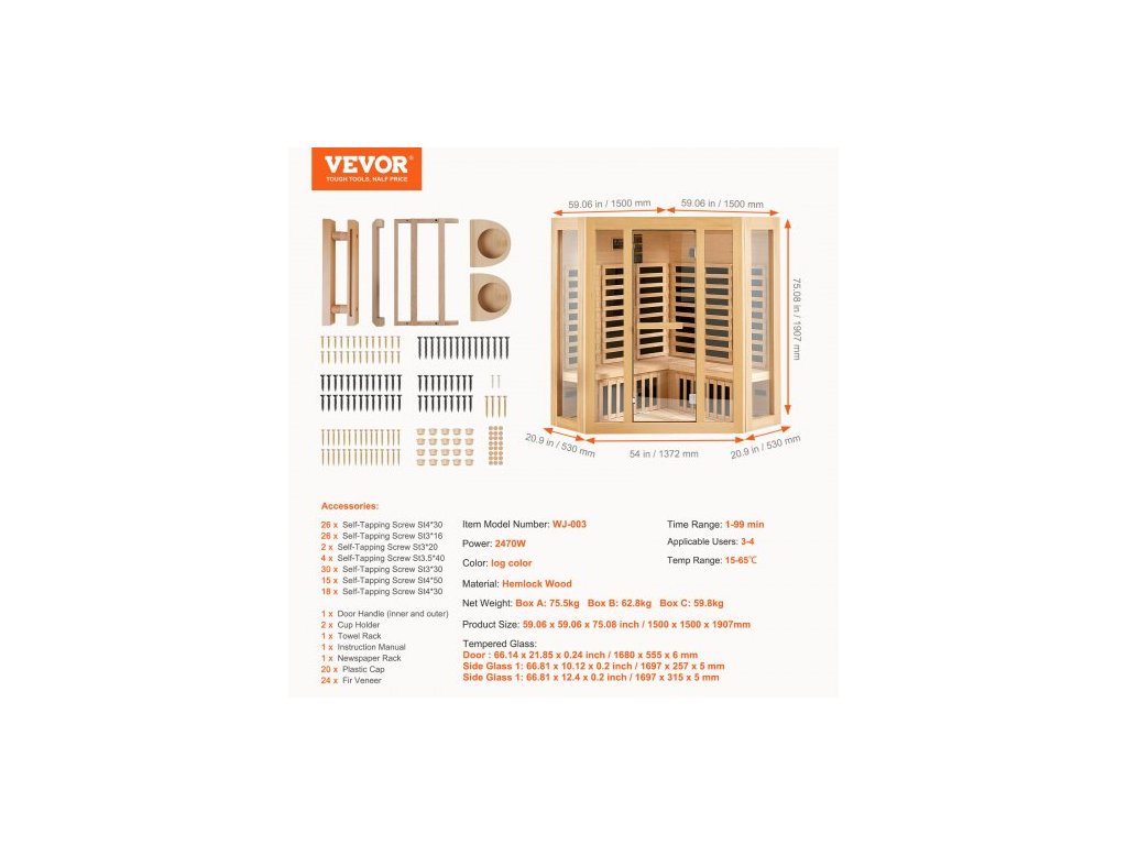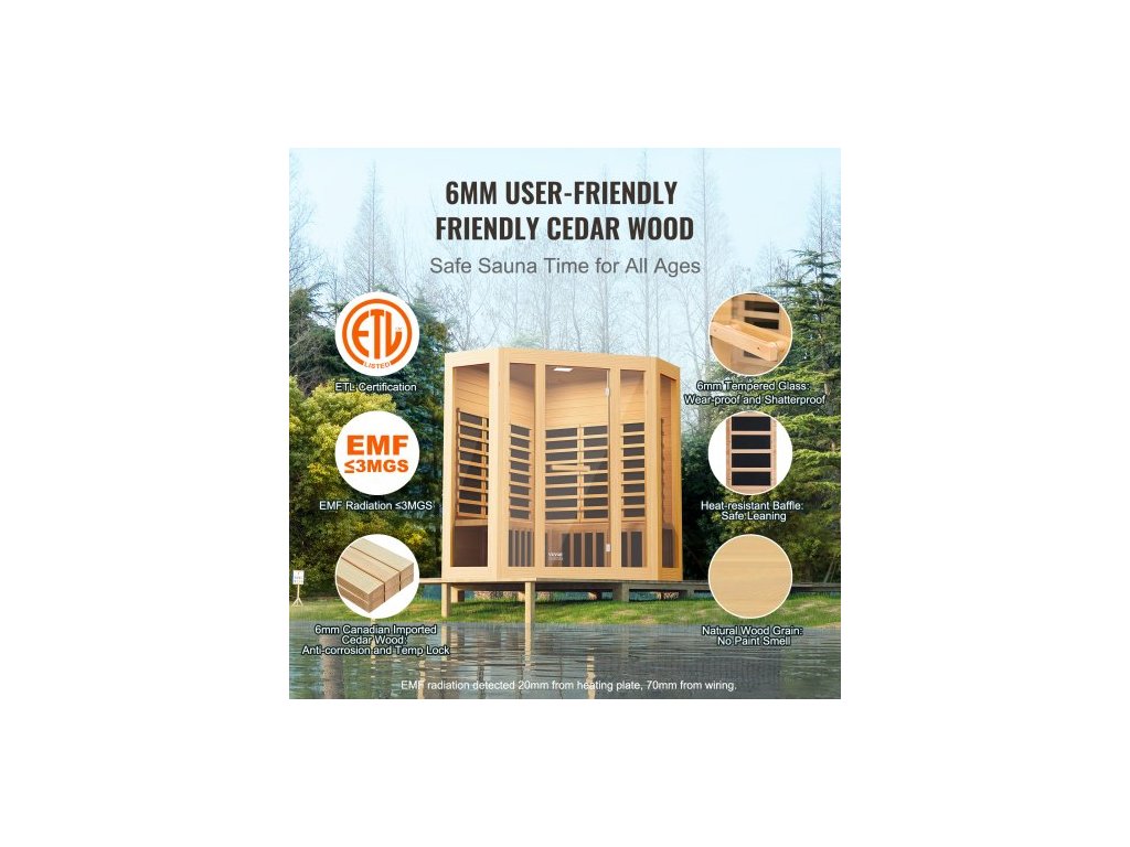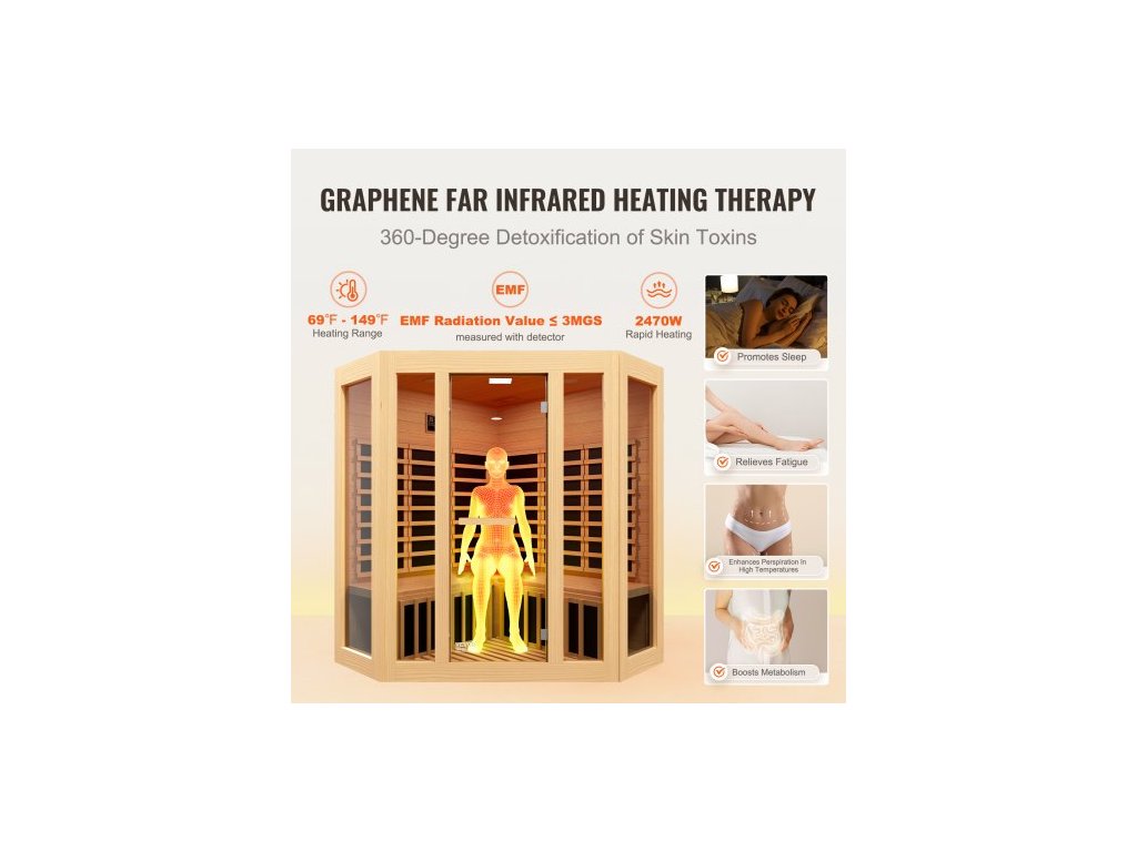 Dřevěná sauna s infračerveným zářením, domácí sauna pro 3 až 4 osoby, nízkoelektromagnetická infračervená sauna z jedlovce s dveřmi z tvrzeného skla, Bluetooth reproduktory a chromoterapeutickými světly, vnitřní výkon 2470 W, návod k údržbě, technologie vytápění grafenem, chromoterapeutický systém, návod k zapojení, vícescénní aplikace, bezpečné používání, časový rozsah: 1–99 min, model: WJ-003, teplotní rozsah: 15–65 ℃, hmotnost bez obalu: 59,8 kg, příkon: 2470 W, hlavní materiál: jedlovce, rozměry výrobku: 1500 x 1500 x 1907 mm, vhodné pro osoby: 3-4, Reproduktor: Duální reproduktory BluetoothDoplňkové parametry