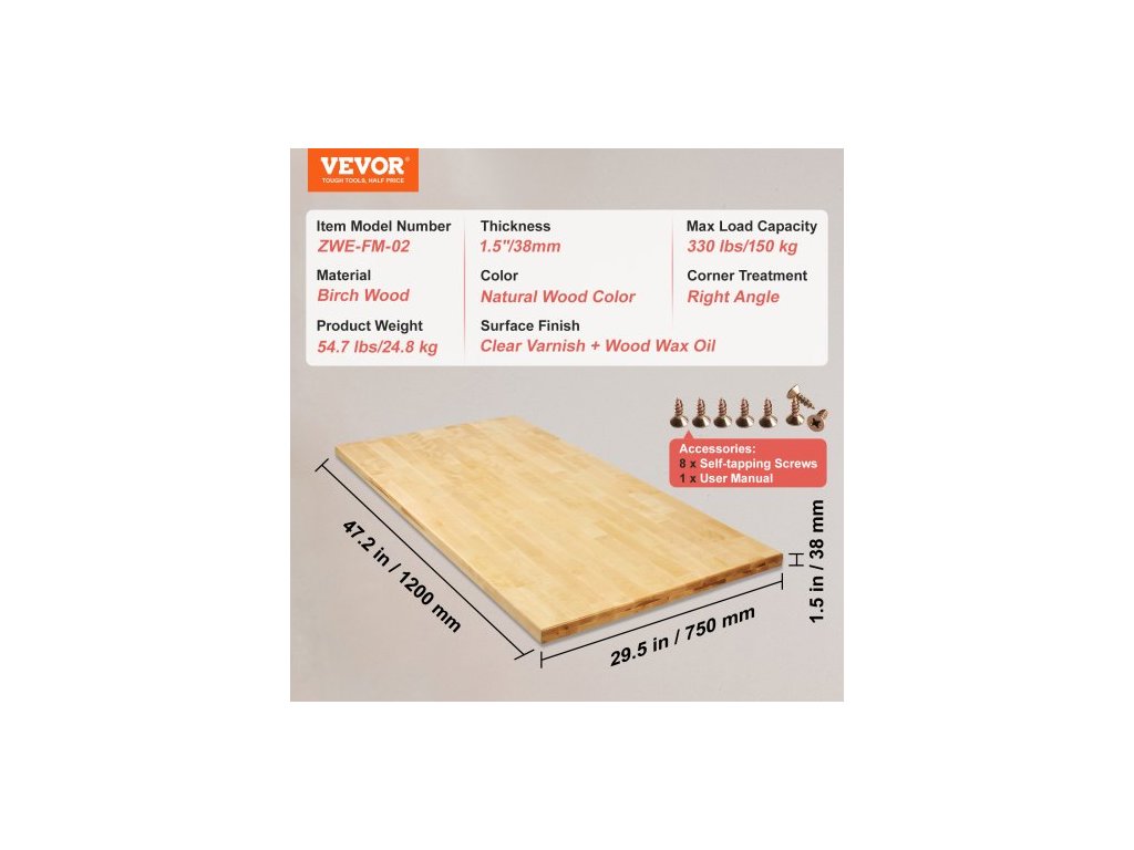 Tloušťka: 38 mm,Úprava rohů: Pravý úhel,Barva: Přírodní javorová barva,Číslo modelu položky: ZWE-FM-02,Hmotnost výrobku: 24,8 kg,Maximální nosnost: 150 kg,Povrchová úprava: Čirý lak + dřevěný voskový olej,Materiál: Javorové dřevo,Rozměry výrobku: 1200 x 750 mm