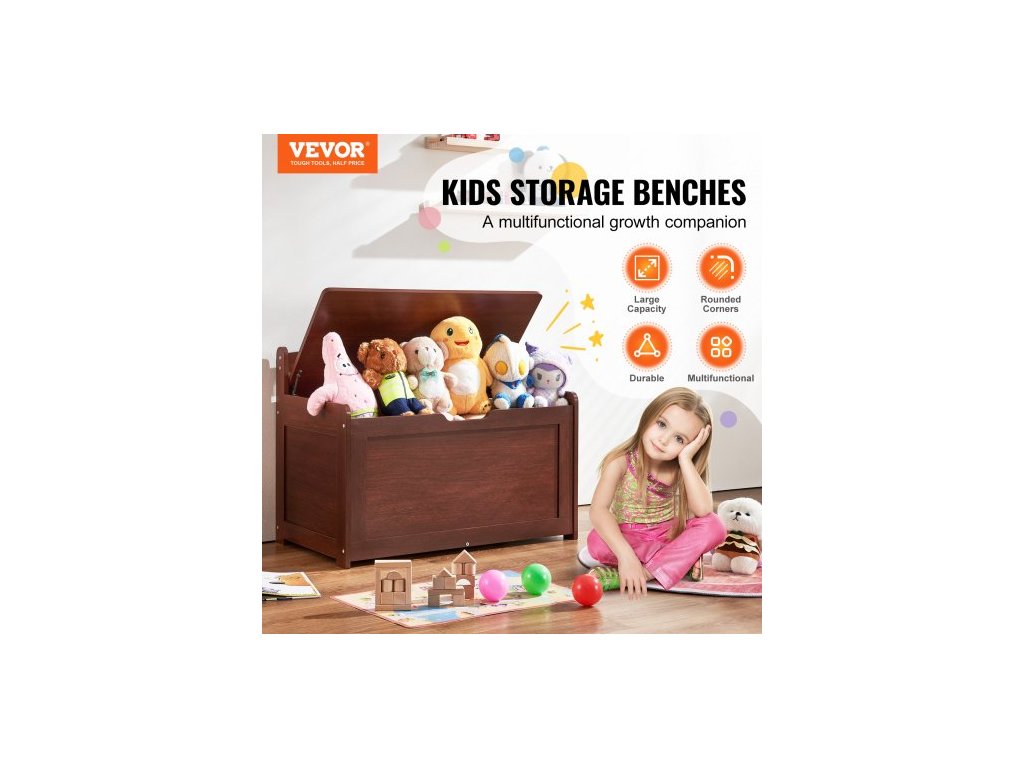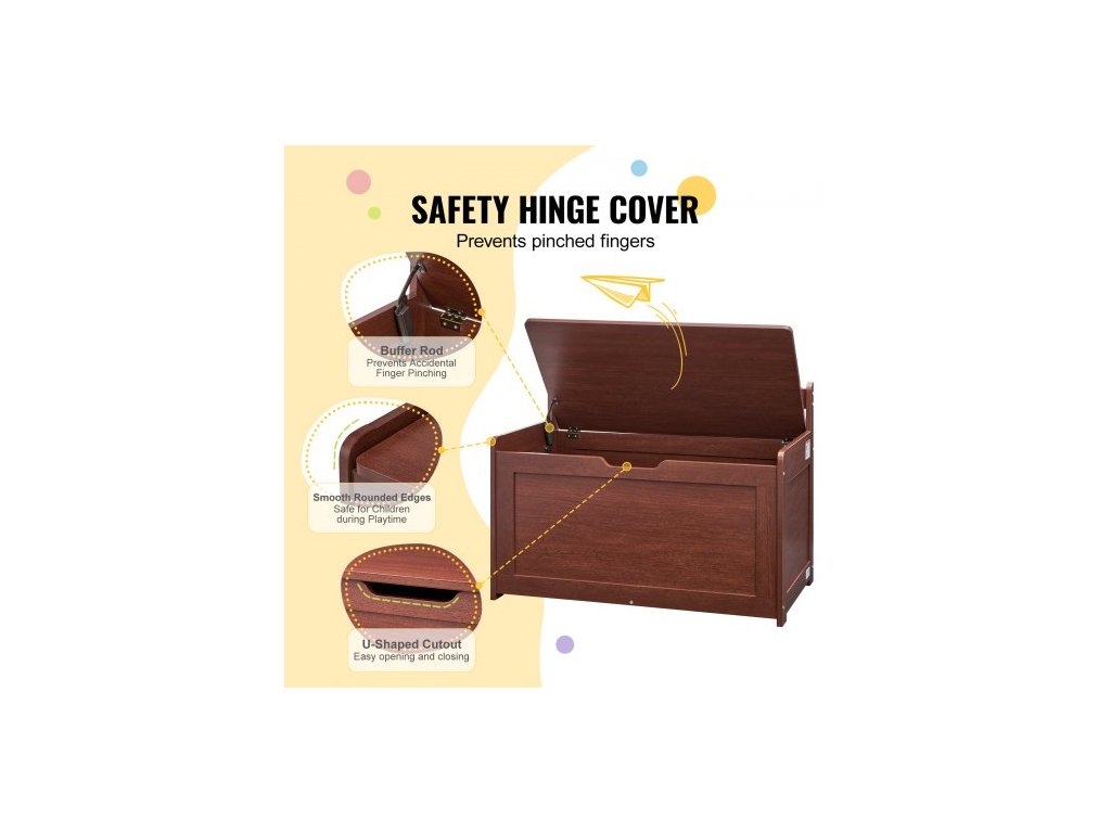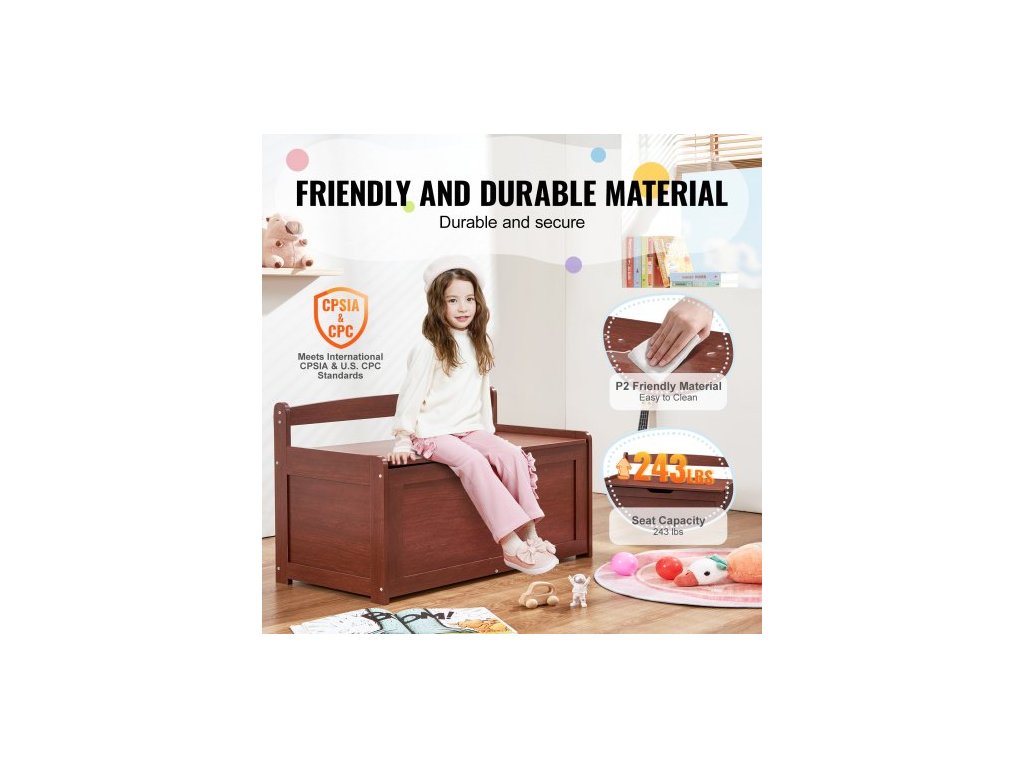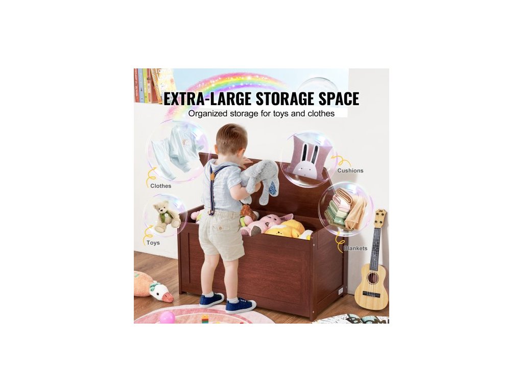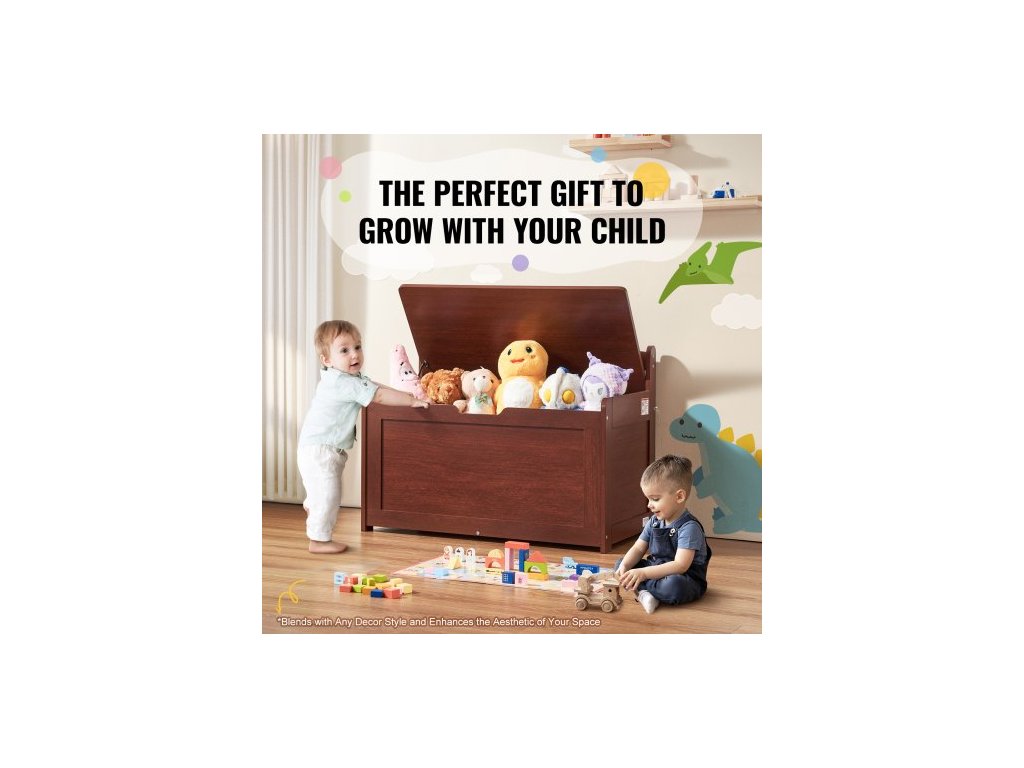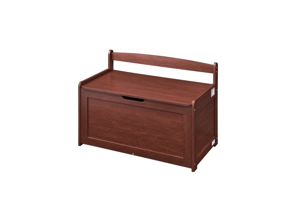 Dřevěná truhla na hračky pro děti, úložný box na hračky pro batolata s odklápěcím víkem a bezpečnostním pantem, velká dětská úložná lavice do herny, ložnice, obývacího pokoje nebo předsíně, třešeň