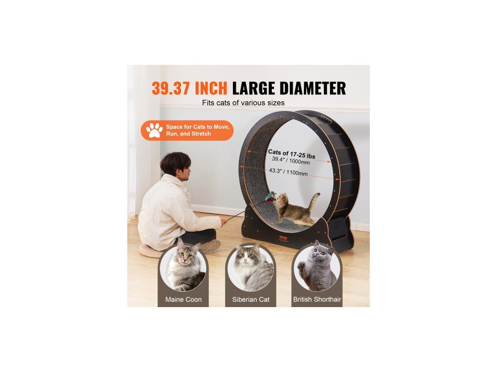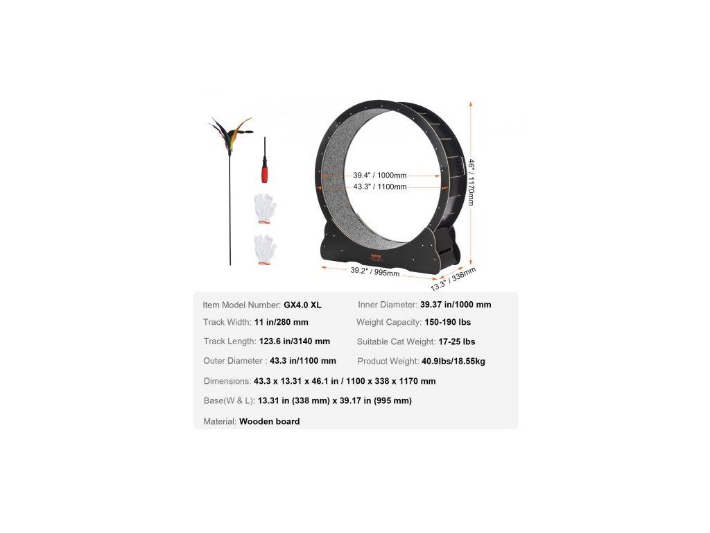 Vnější průměr: 43,3 palce/1100 mm,Základna (Š a D): 13,31 palce (33,8 cm) x 39,17 palce (99,5 cm),Šířka dráhy: 11 palců/280 mm,Vhodná hmotnost pro kočky: 17-25 lbs,Nosnost: 150-190 lbs,Rozměry výrobku (D x Š x V): 43,3 x 13,31 x 46,1 palce / 110 x 33,8 x 117 cm, vnitřní průměr: 1000 mm, číslo modelu položky: GX4.0 XL, hmotnost výrobku: 18,55 kg, materiál: dřevěná deska, délka kolejnice: 3140 mm