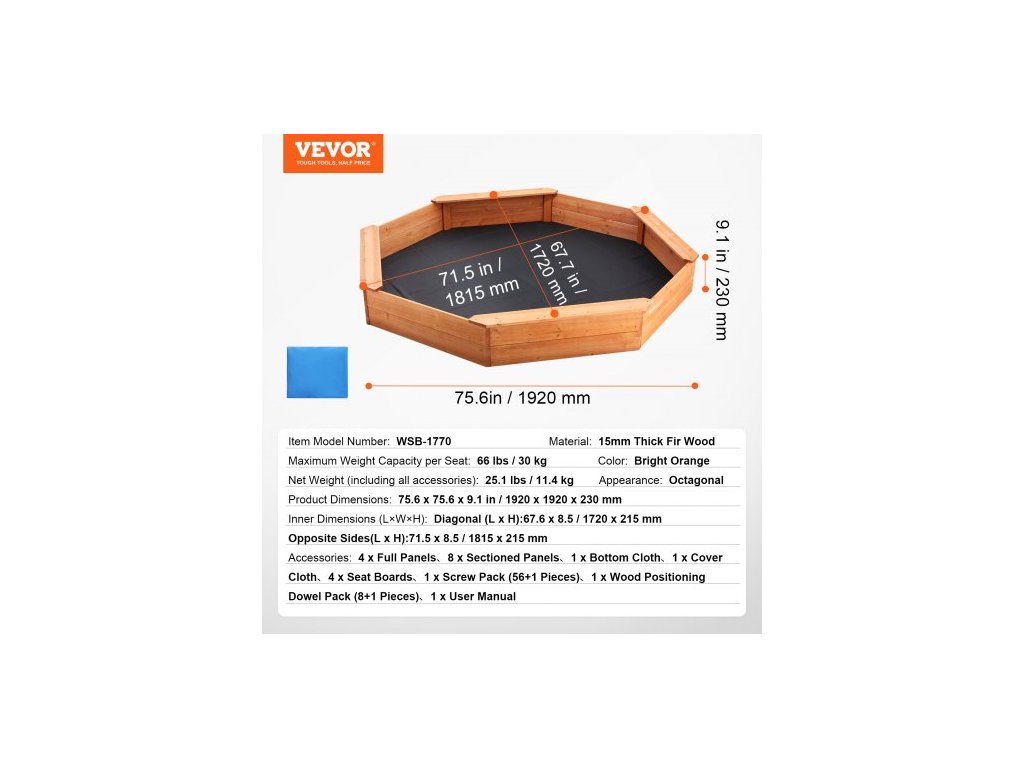 Čistá hmotnost (včetně veškerého příslušenství): 25,1 lbs / 11,4 kg,Maximální nosnost na sedátko: 66 lbs / 30 kg,Číslo modelu položky: WSB-1770,Materiál: 15mm silné jedlové dřevo,Rozměry výrobku: 75,6 x 75,6 x 9,1 palce / 1920 x 1920 x 230 mm,Vzhled: Osmihranný