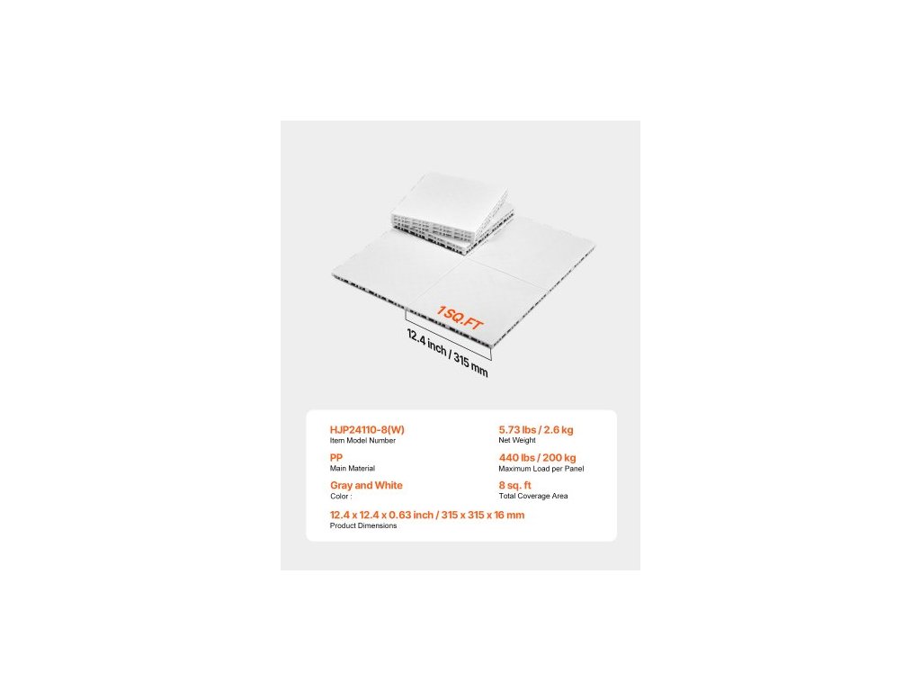 Celková plocha pokrytí: 8 čtverečních stop,Barva: Šedá a bílá,Číslo modelu položky: HJP24110-8,Maximální zatížení na panel: 440 lbs / 200 kg,Množství: 8 ks,Rozměry produktu: 12,4 x 12,4 x 0,63 palce / 315 x 315 x 16 mm,Čistá hmotnost: 5,73 lbs / 2,6 kg,Hlavní materiál: PP