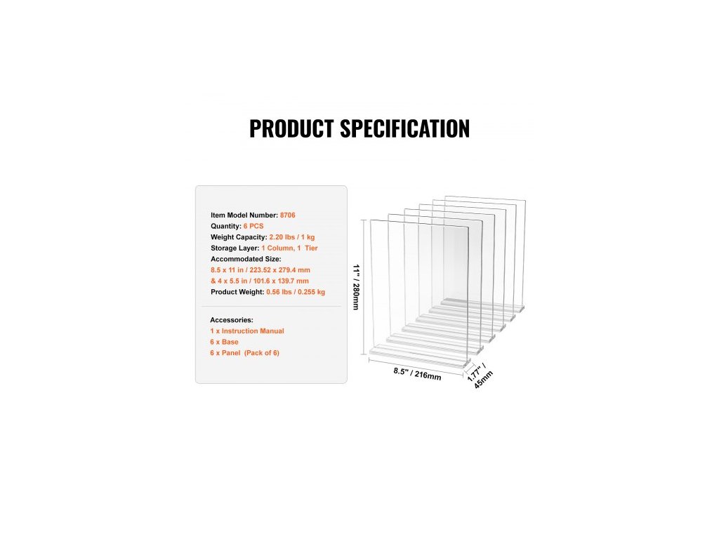 Úložná vrstva: 1 sloupec, 1 patro, Nosnost: 2,20 lbs / 1 kg, Číslo modelu položky: 8706, Hmotnost výrobku: 0,56 lbs / 0,255 kg, Množství: 6 ks, Rozměry po balení: 8,5 x 11 palců / 223,52 x 279,4 mm a 4 x 5,5 palců / 101,6 x 139,7 mm, Rozměry výrobku: 8,5 x 11 x 1,77 palce / 235 x 200 x 45 mm