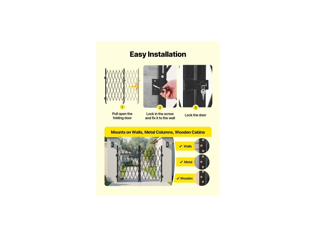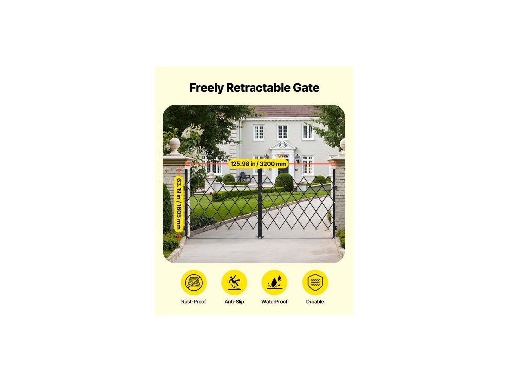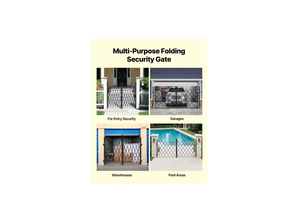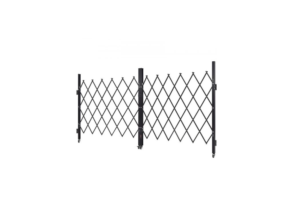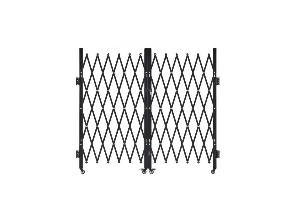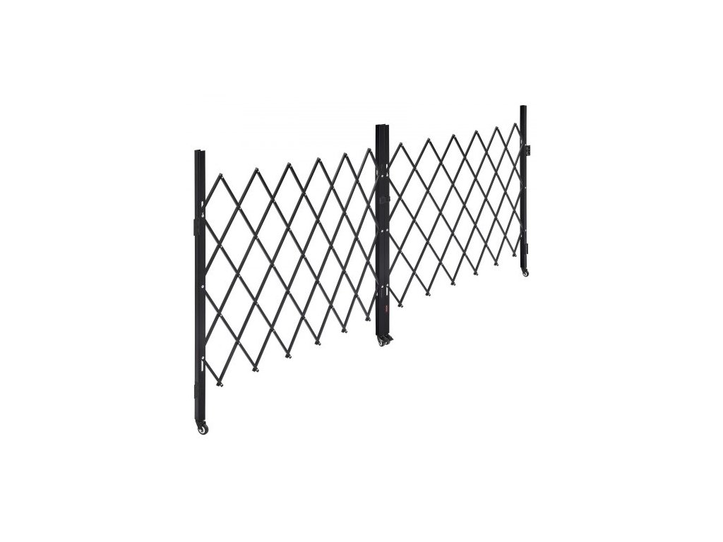 Dvojitá skládací bezpečnostní brána , uzamykatelná nůžková brána s otočnými kolečky o 360°, venkovní ocelová zatahovací brána s barikádou, pro zabezpečení vstupu, garáže, skladu a bazénu, 320 × 160,5 cm (Š × V)