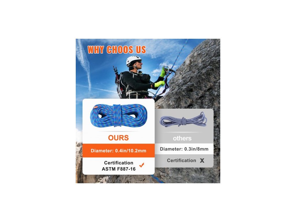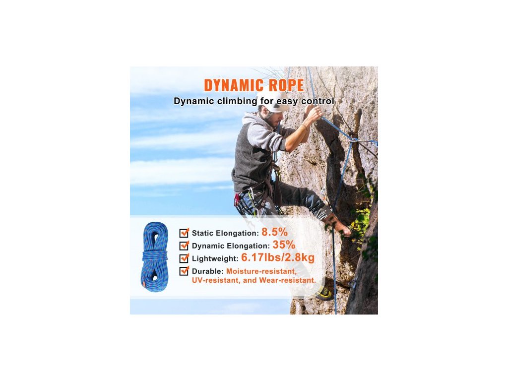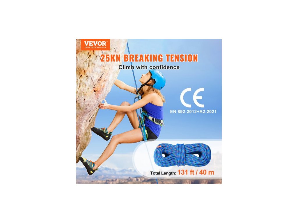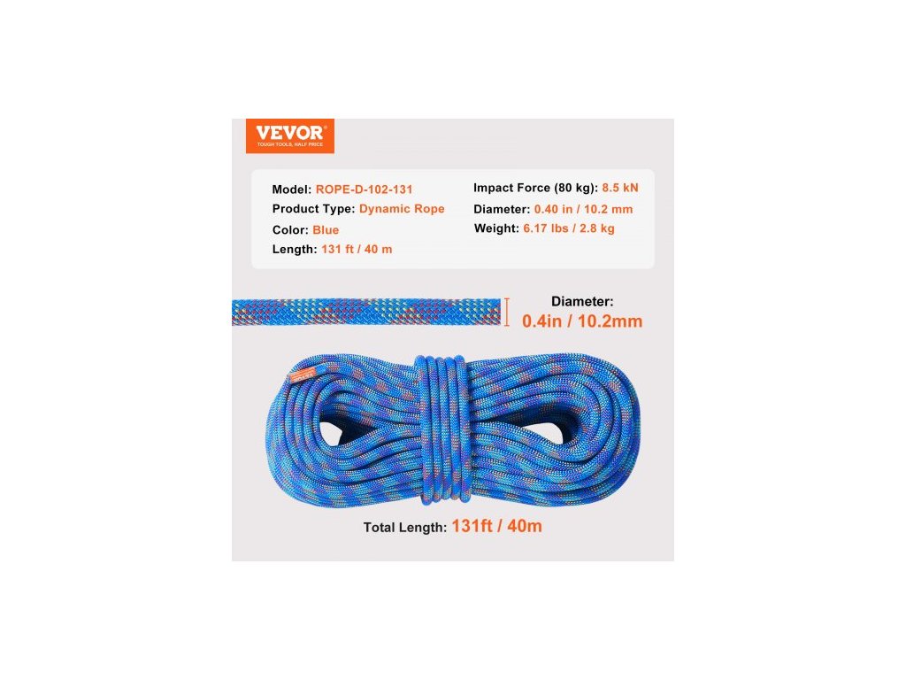 Typ produktu: Dynamické lano,Délka: 131 stop / 40 m,Rázová síla (80 kg): 8,5 kN,Barva: Modrá,Model: ROPE-D-102-131,Průměr: 10,2 mm / 0,40 palce,Hmotnost: 6,17 liber / 2,8 kg