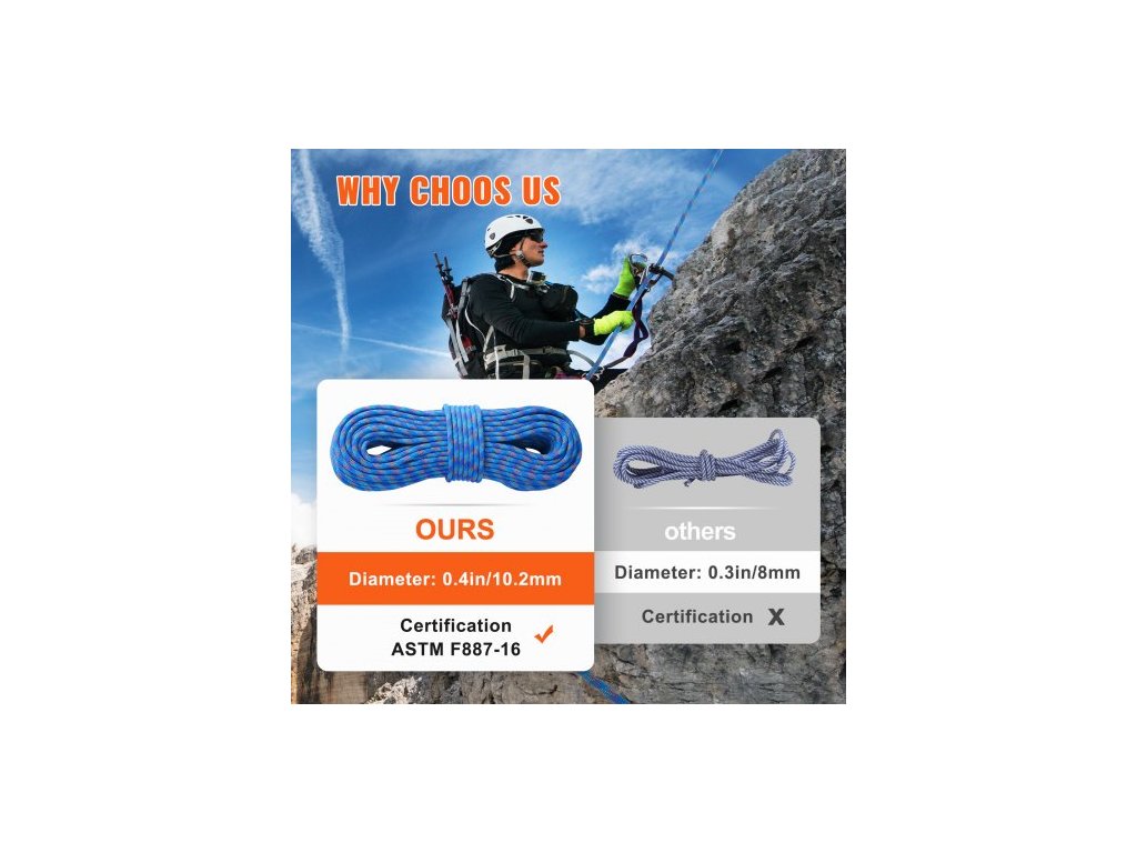 Dynamické lezecké lano 10,2 mm, 60 m (197 stop), venkovní lezecké lano, mezní napětí 25 kN, roztažitelné vláknité lano s ocelovými karabinami pro únik, slaňování a hasičskou záchranu, modréBezpečnost na prvním místě