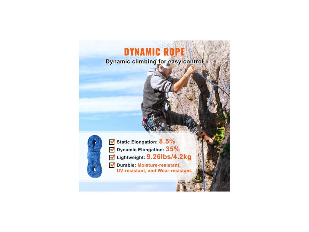 Typ produktu: Dynamické lano,Délka: 197 stop / 60 m,Rázová síla (80 kg): 8,5 kN,Barva: Modrá,Model: ROPE-D-102-197,Hmotnost: 4,2 lbs / 9,26 kg