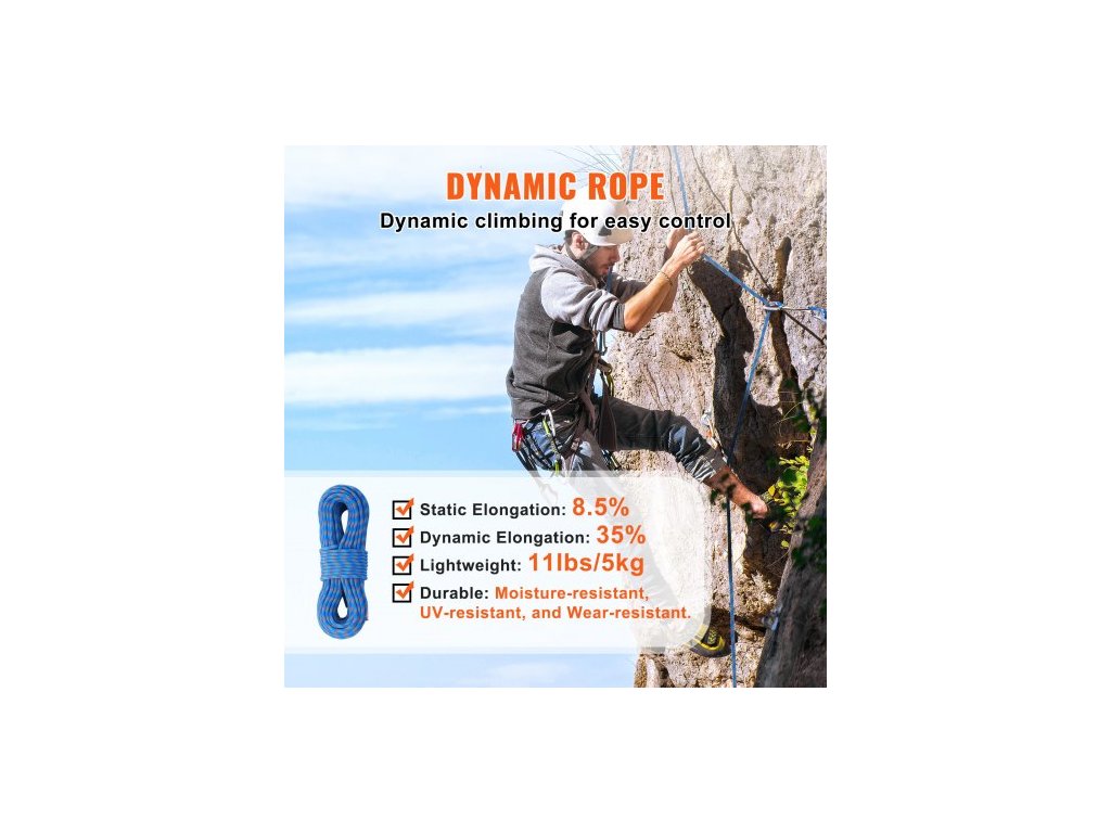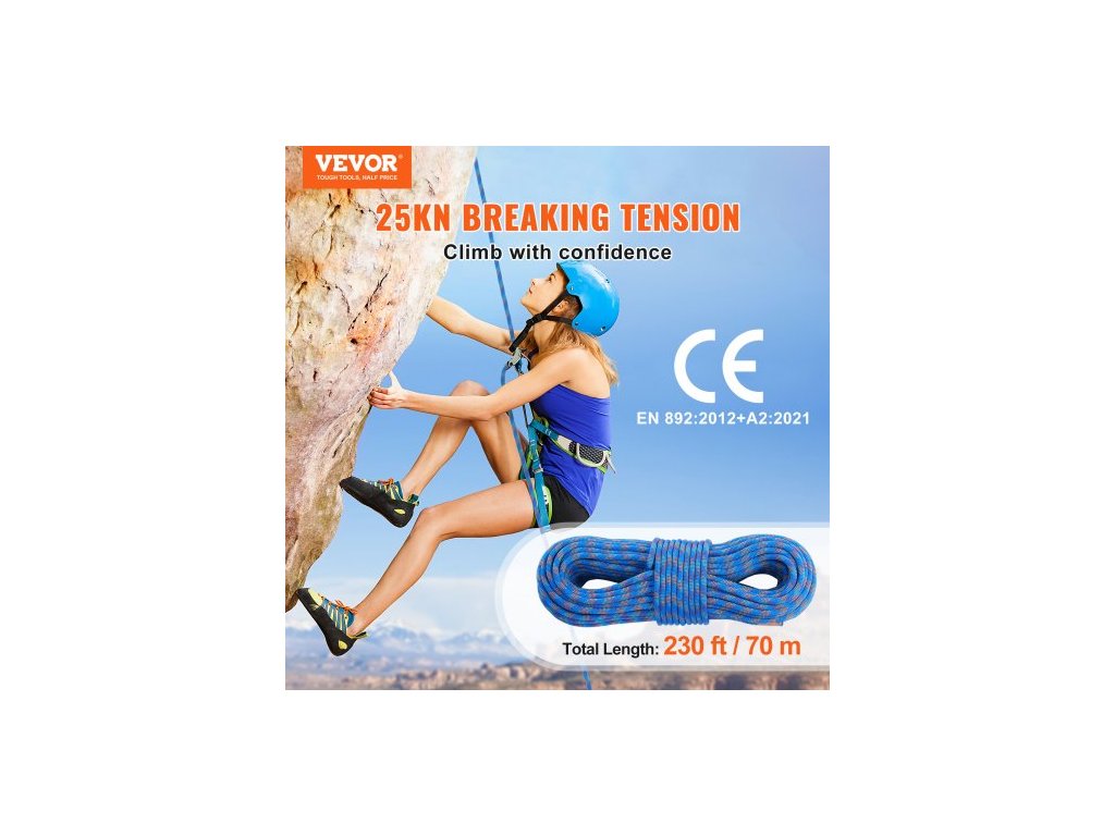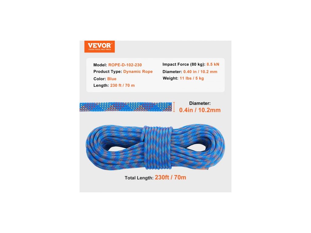 Typ produktu: Dynamické lano,Délka: 230 stop (70 m),Barva produktu: Modrá,Hmotnost produktu: 5 kg / 11 liber,Číslo modelu: ROPE-D-102-230,Průměr: 10,2 mm / 0,40 palce,Síla prvního nárazu (80 kg): 8,5 kN