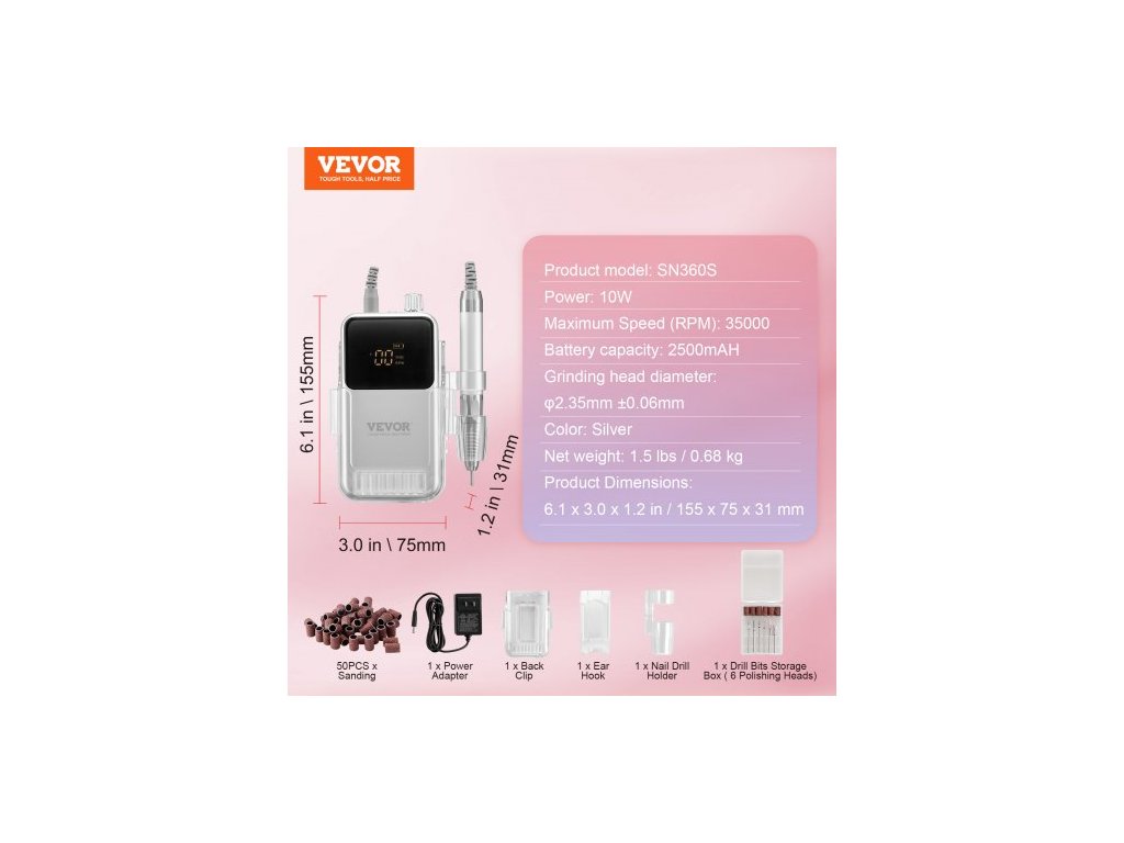 Průměr brusné hlavy: φ2,35 mm ±0,06 mm,Kapacita baterie: 2500 mAH,Barva: Stříbrná,Číslo modelu položky: SN360S,Rozměry produktu: 6,1 x 3,0 x 1,2 palce / 155 x 75 x 31 mm,Maximální rychlost (ot./min): 35000,Čistá hmotnost: 1,5 lbs / 0,68 kg,Příkon: 10 W