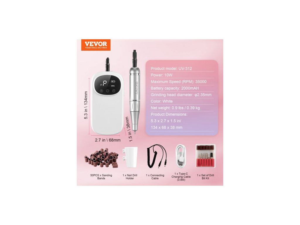 Průměr brusné hlavy: φ2,35 mm, Kapacita baterie: 2000 mAH, Barva: Bílá, Číslo modelu: UV-312, Rozměry produktu: 5,3 x 2,7 x 1,5 palce / 134 x 68 x 38 mm, Maximální rychlost (ot./min): 35 000, Čistá hmotnost: 0,9 lbs / 0,39 kg, Výkon: 10 W