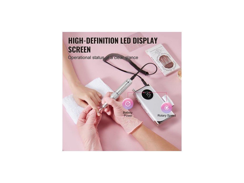 Elektrická dobíjecí vrtačka na nehty , přenosný akumulátorový pilník na nehty s rychlostí 40 000 ot./min, bruska na akrylové gely s LCD displejem, 6 bity a 50 ks brusných pásů pro manikúru, pedikúru a lakováníProdloužená výdrž baterie